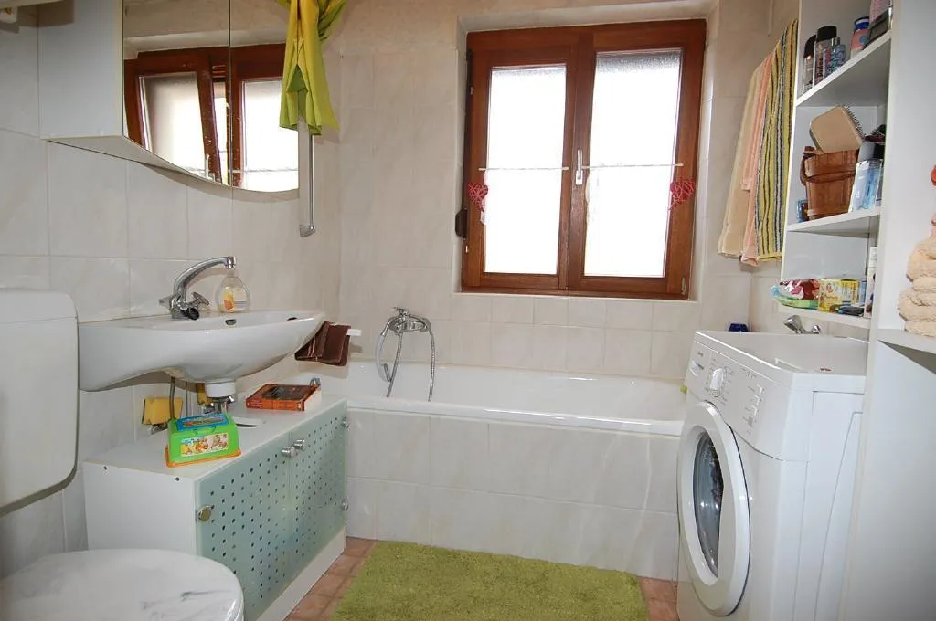 Das Tageslichtbadezimmer verfügt über ein Fenster. Der Boden ist gefliest, die Wände sind halb hoch gefliest. Das Bad ist ausgestattet mit einer Wanne, einem WC und einem Waschmaschinenanschluss.