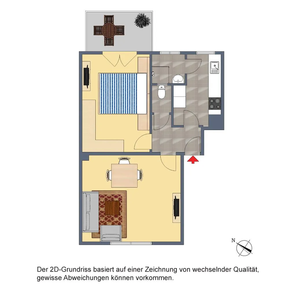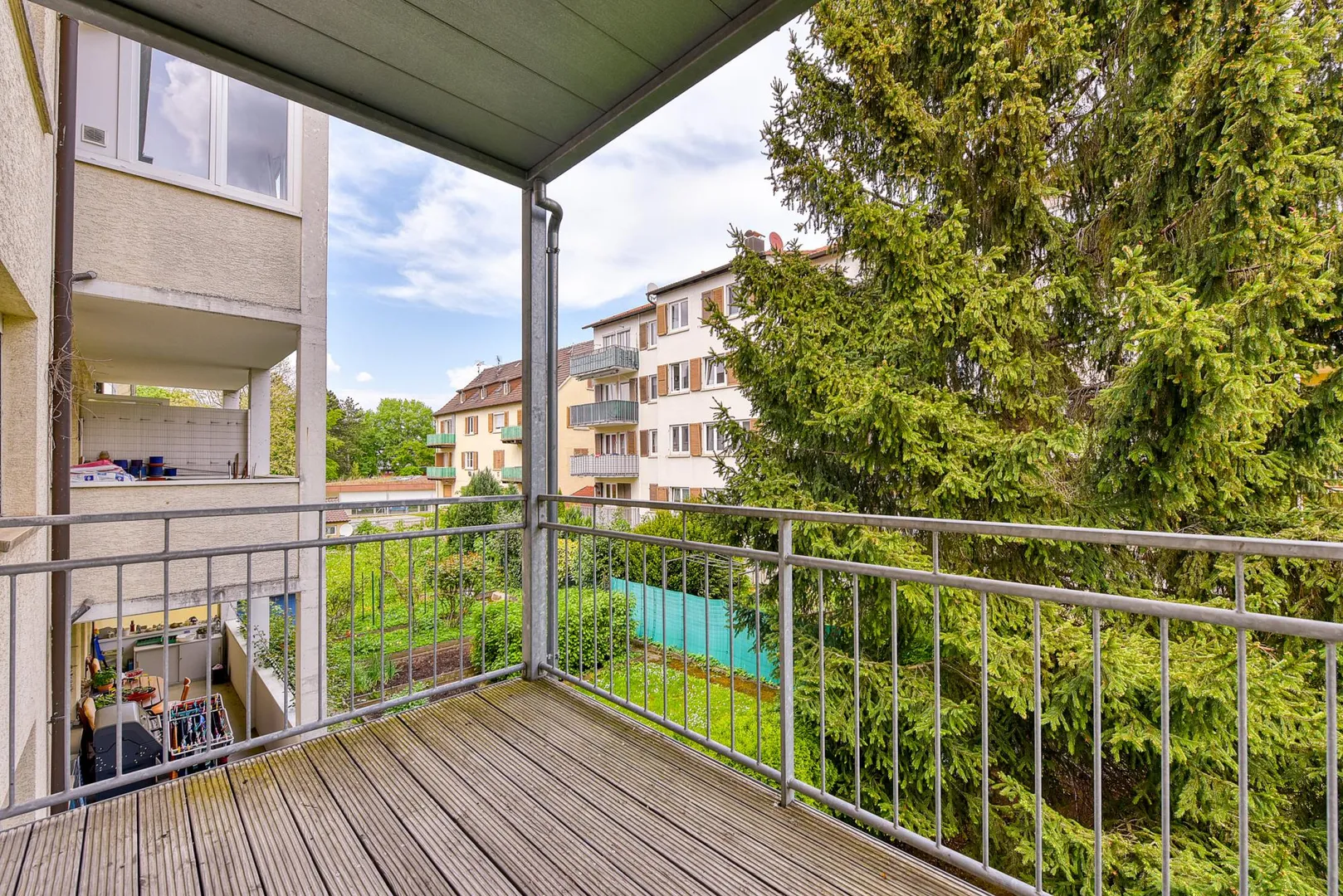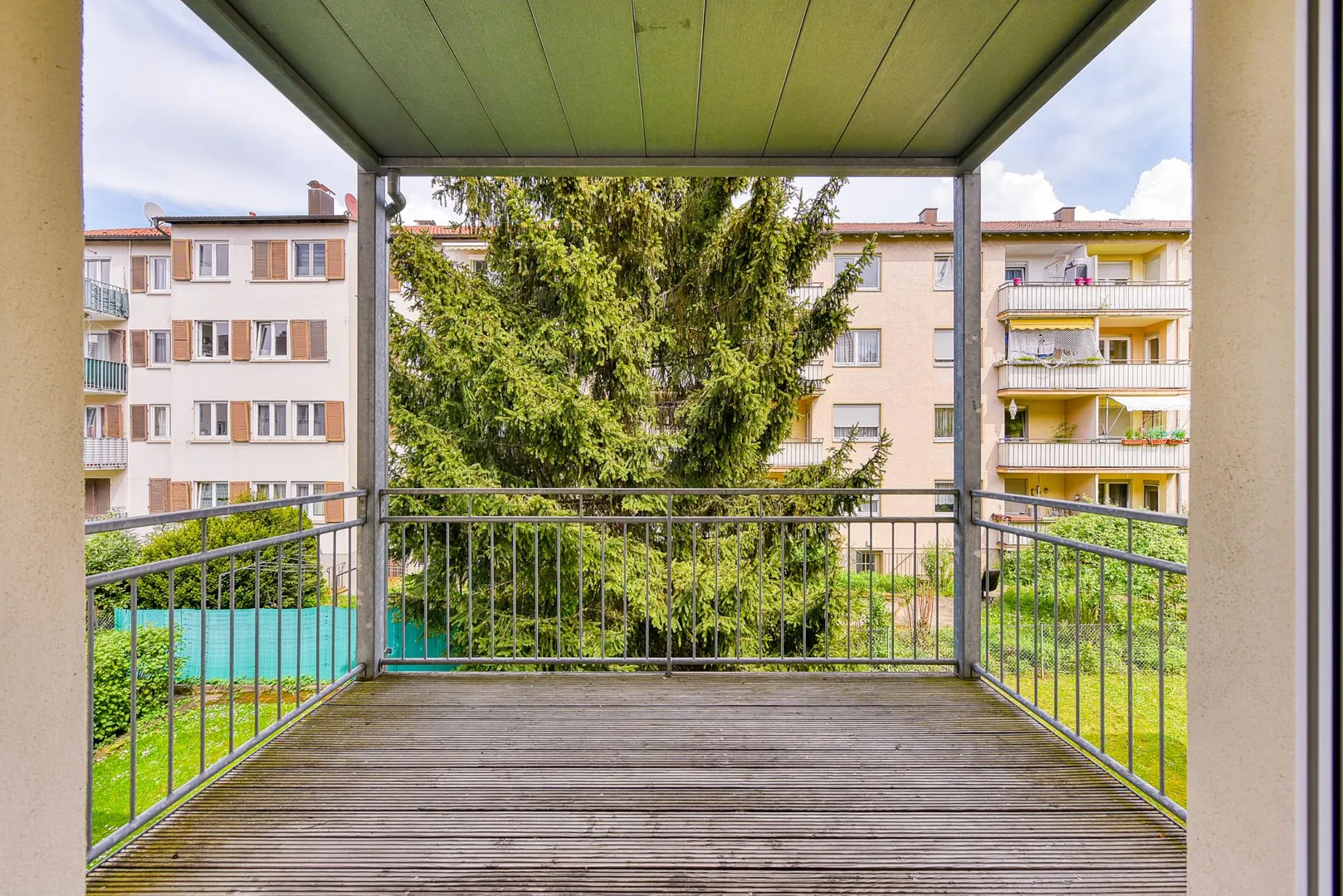 Der ca. 6,6 m² große und überdachte Balkon wurde an der Nord/Ost-Seite ans Schlafzimmer angebaut. Die Küche sowie das Schlafzimmer sind ebenso nach Nord-Osten ausgerichtet.