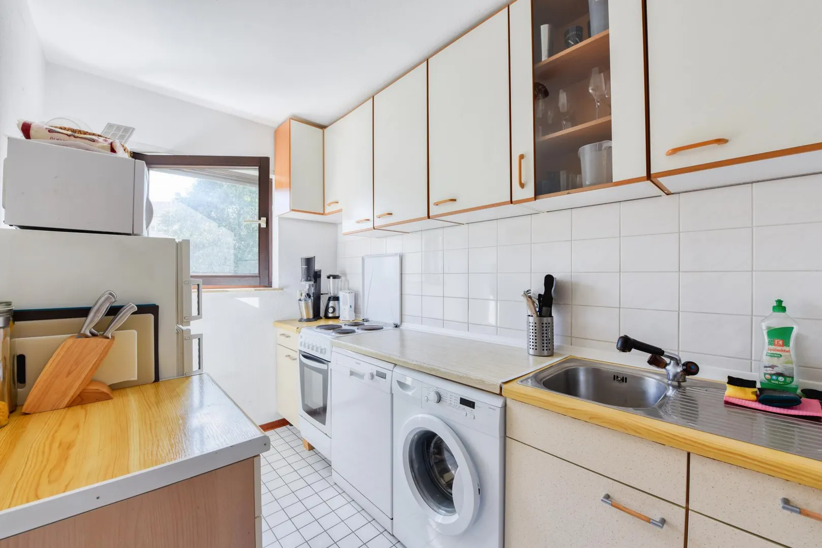 Die Küche ist über das Wohnzimmer begehbar, verfügt über einen Waschmaschinenanschluss und über eine ältere Einbauküche.