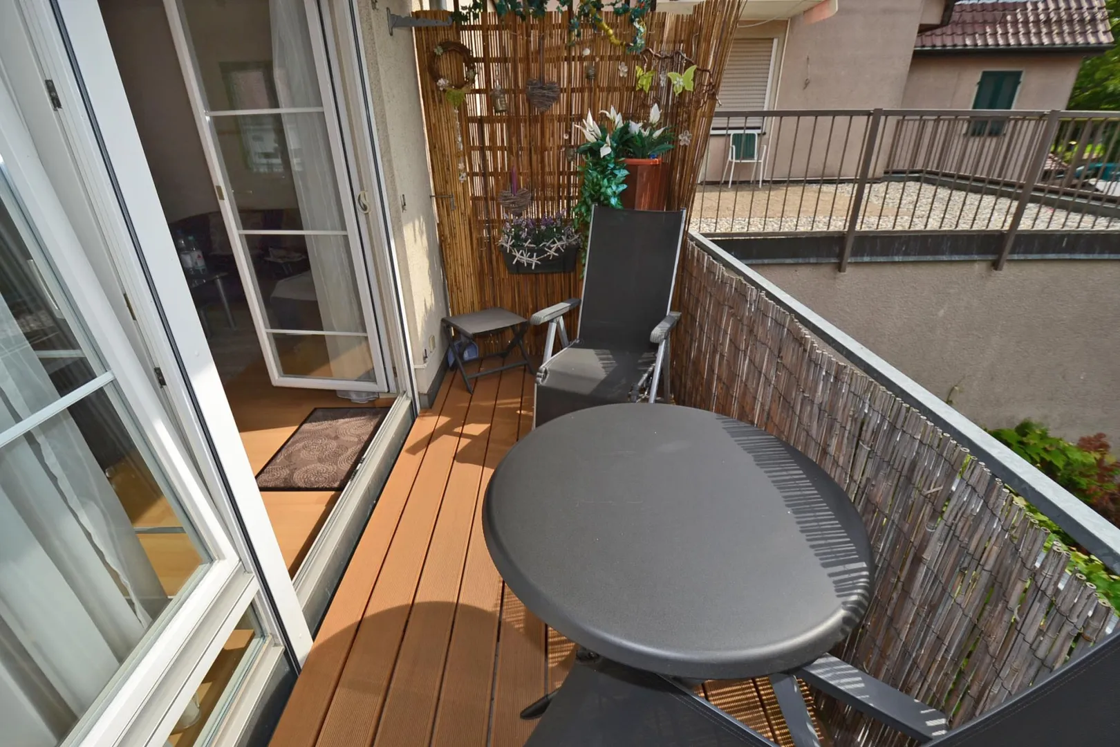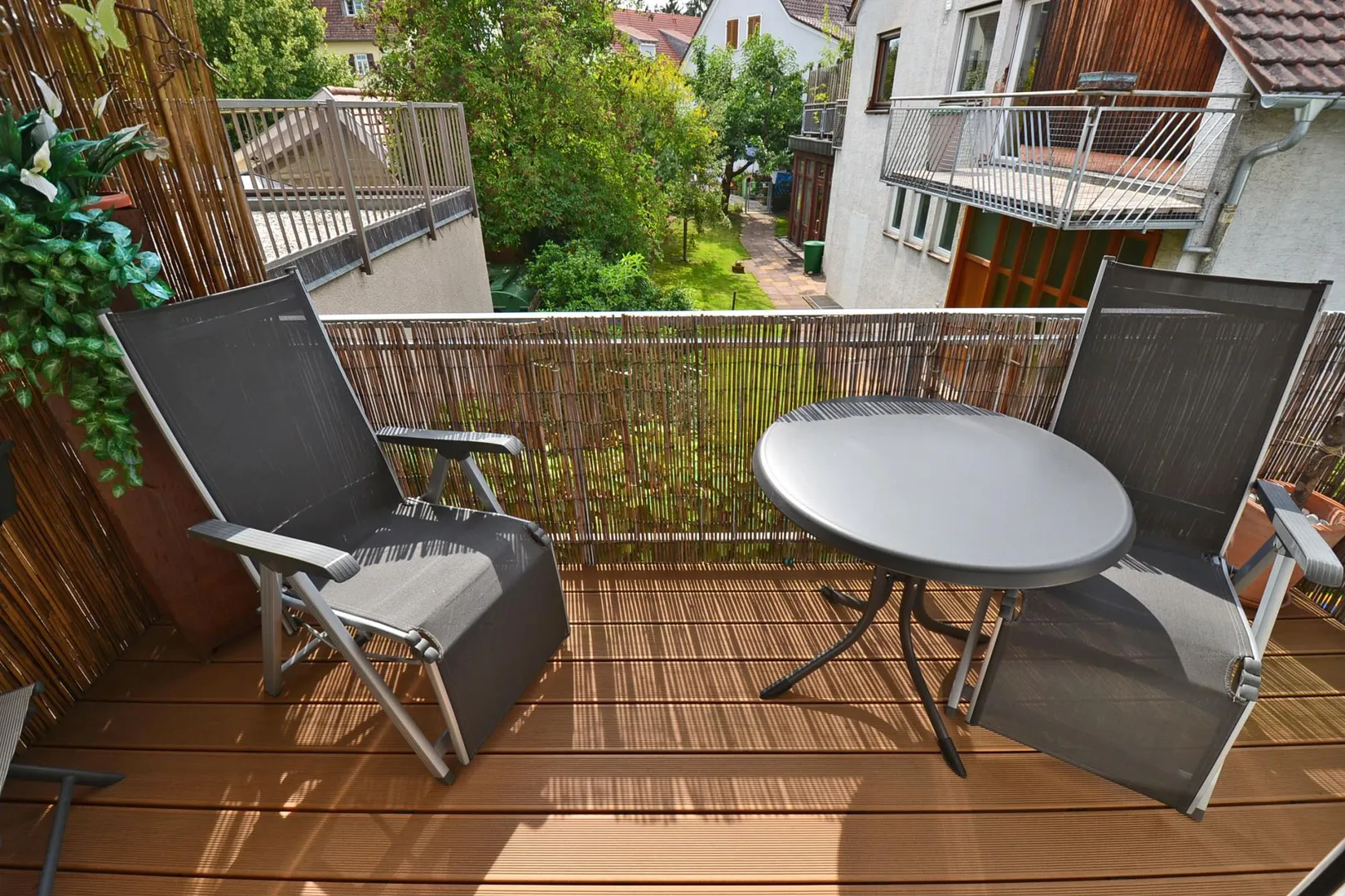 An der Westseite des Wohnzimmers befindet sich der sonnige und überdachte Balkon. Hier ist ein pflegeleichter Kunststoffboden in Holzoptik verlegt.
