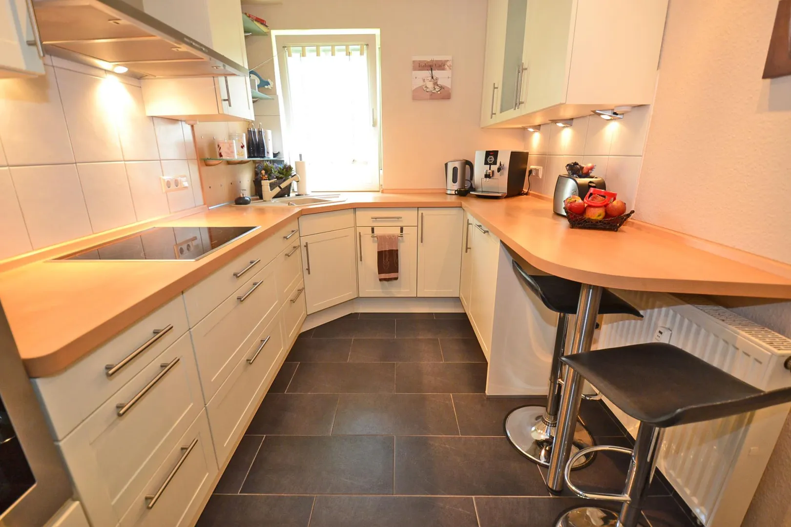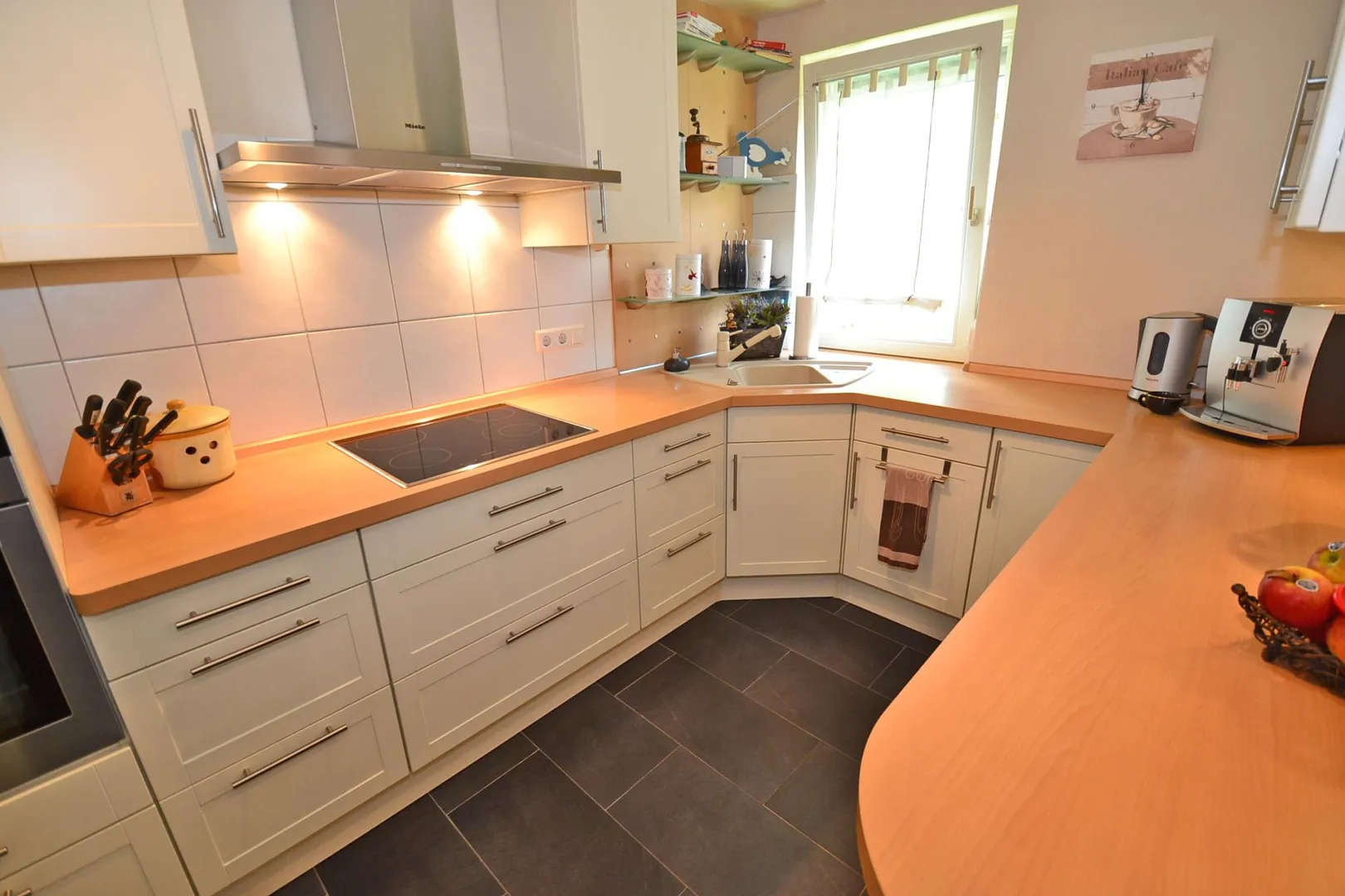 Die Einbauküche ist ausgestattet mit Cerankochfeld, Backofen und Mikrowelle in Arbeitshöhe, großer Umluft-Dunstabzug, Geschirrspülmaschine, Kühlschrank mit separatem Gefrierschrank, Keramikspüle sowie Stauraum in Ober- und Unterschränken.