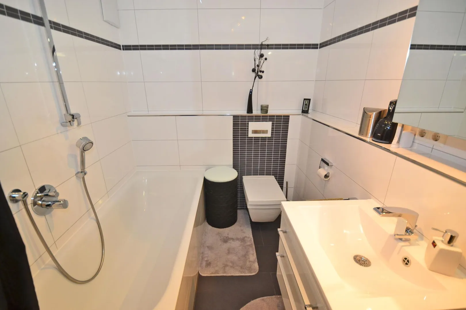 Das Badezimmer ist raumhoch weiß gefliest und mit anthrazifarbenen Fliesenboden, Badewanne, Handtuchhalter-Heizkörper, Waschbecken, WC und einer separat schaltbaren elektrischen Lüftung ausgestattet.