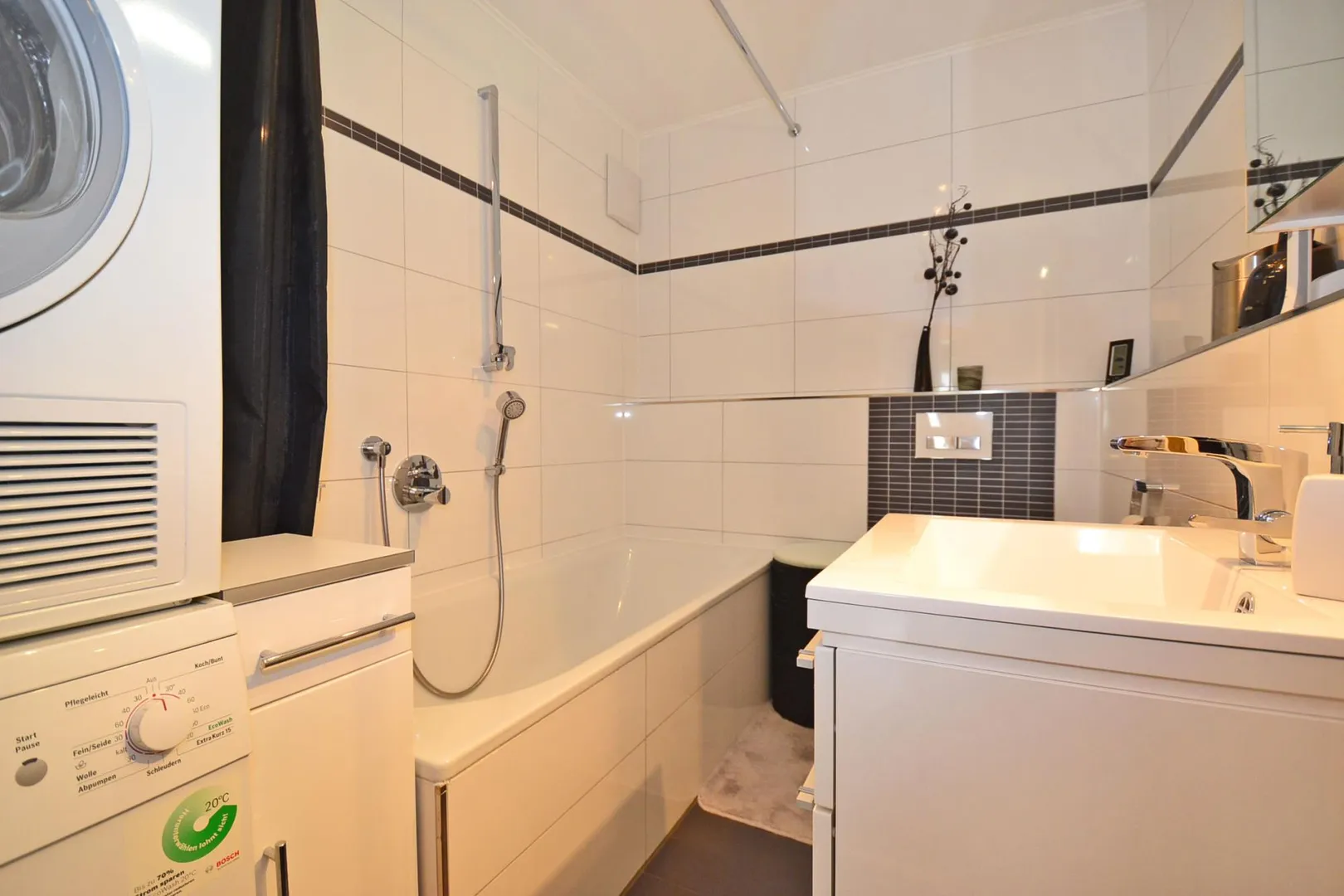 Im Bad befinden sich auch der Stellplatz für Waschmaschine und Trockner.