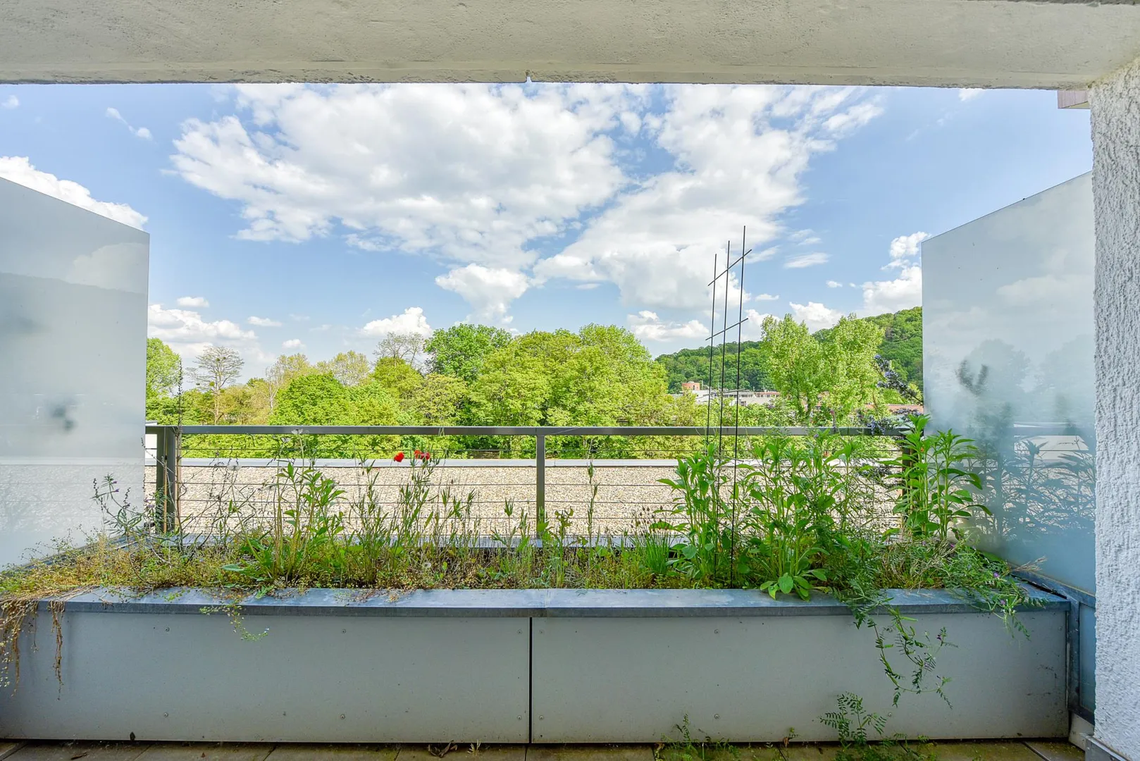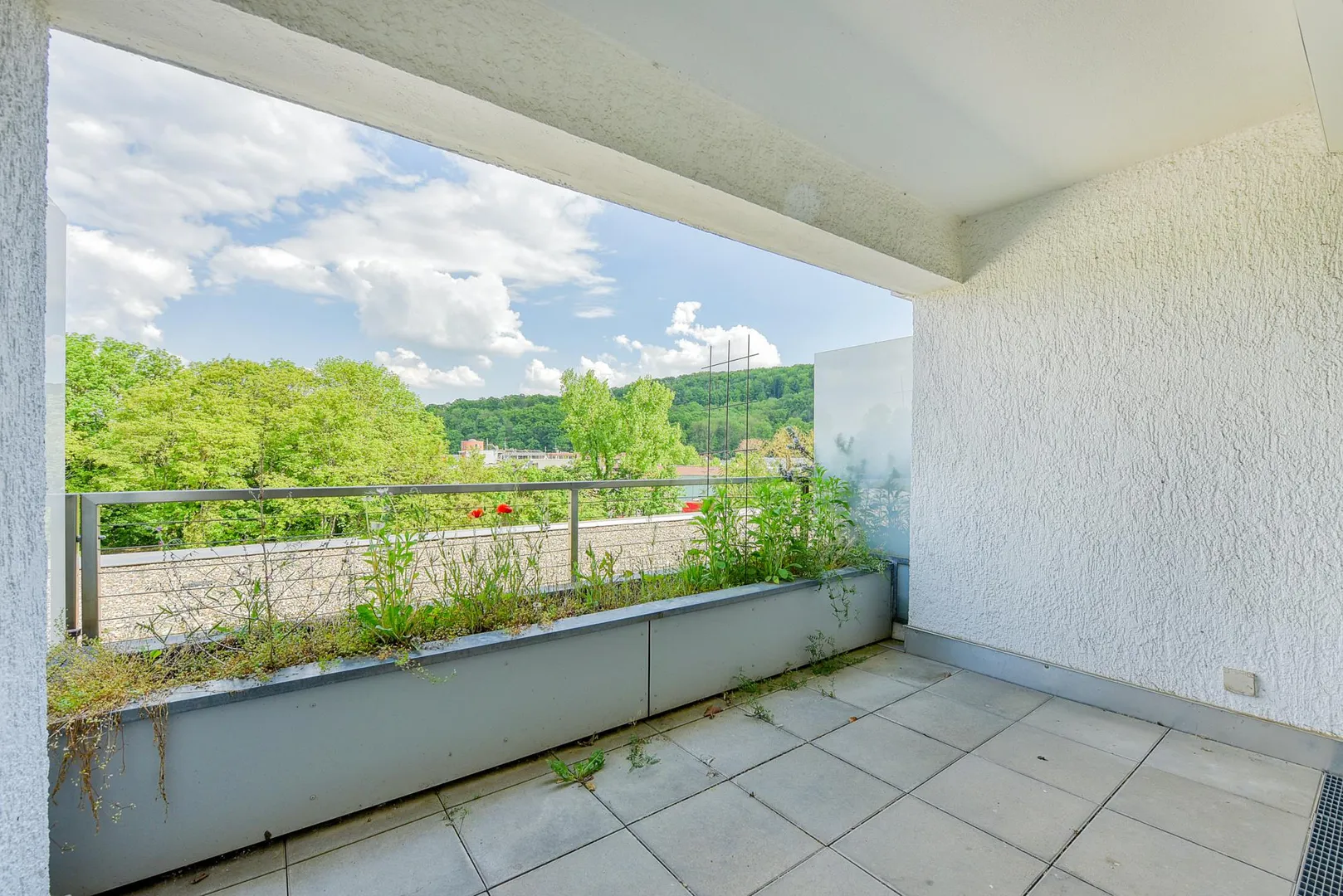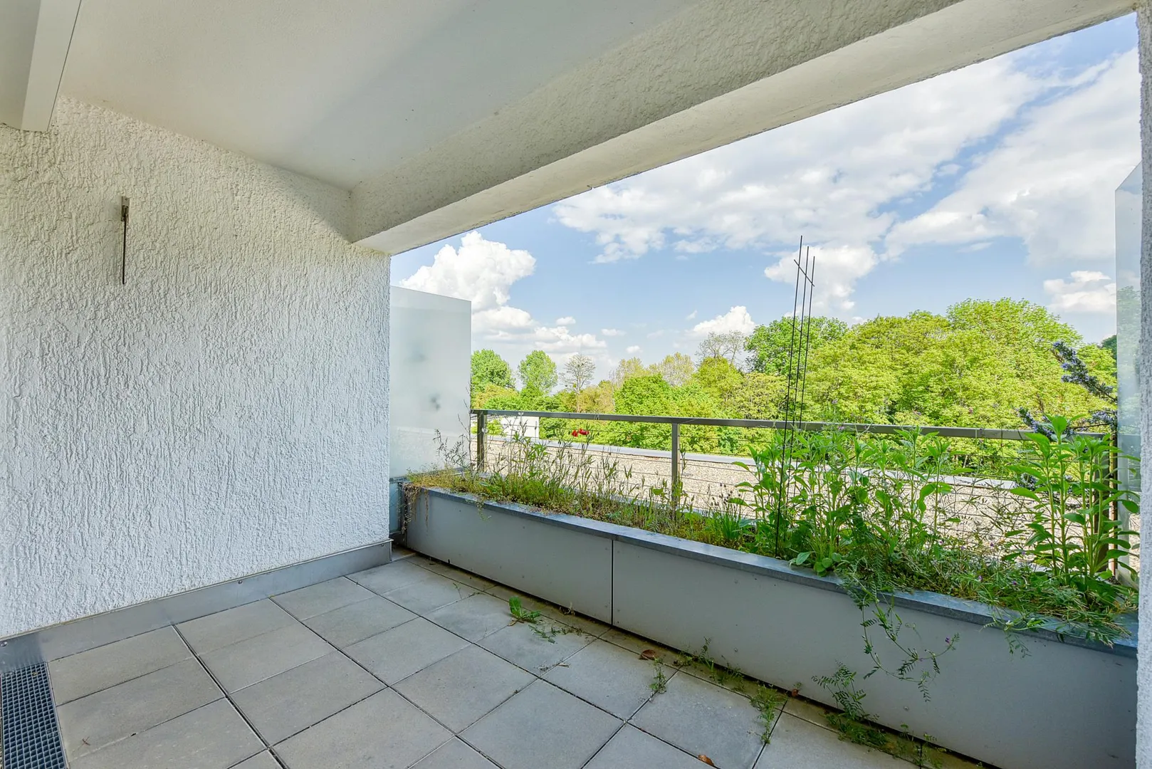 Der ca. 6 m² große und überdachte Balkon ist nach Osten ausgerichtet und ist ausgestattet mit einem Pflanzbeet.