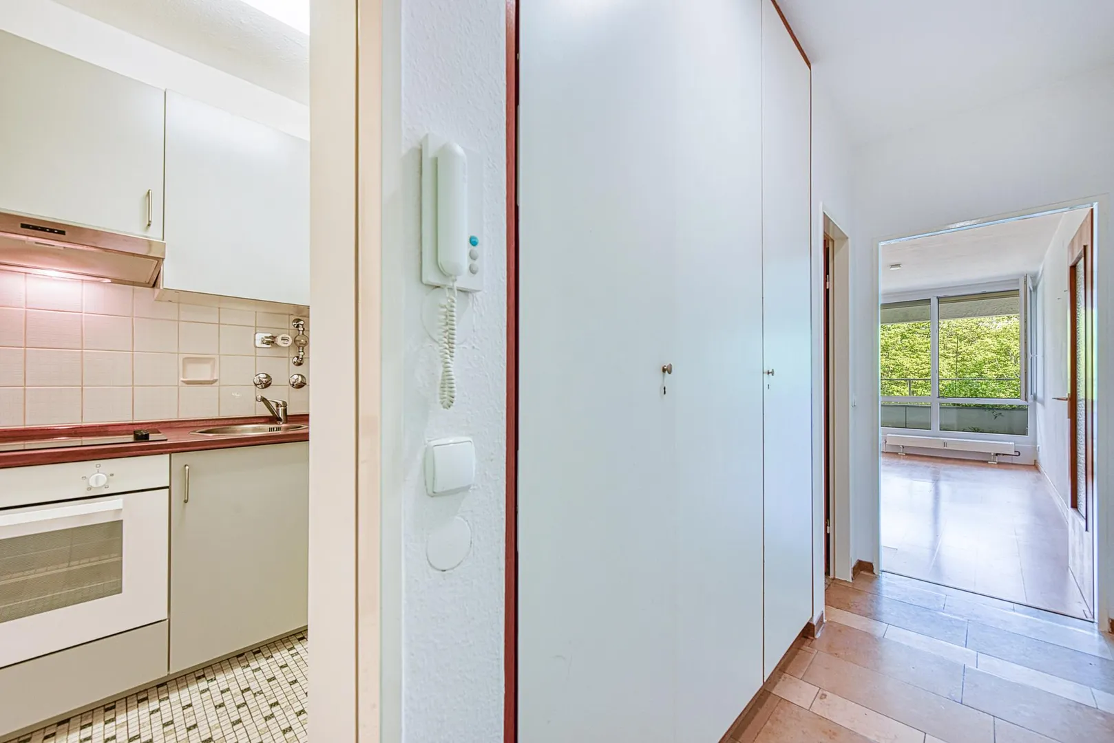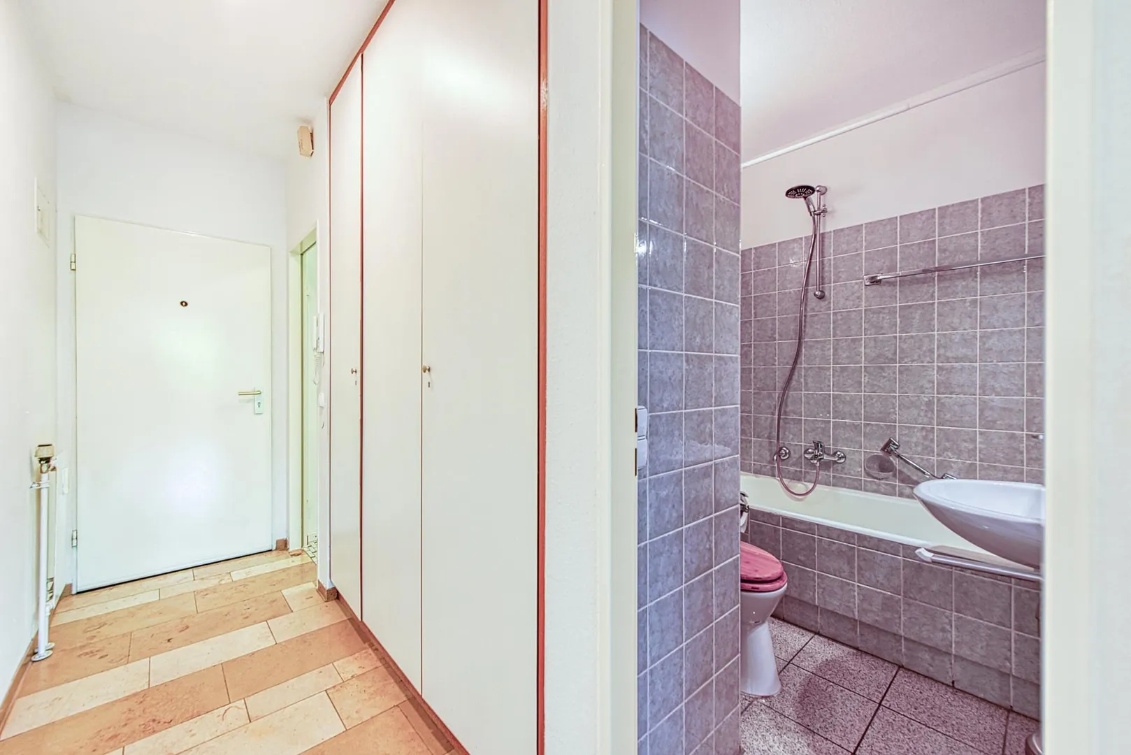 Im Flur sind Solnhofer-Fliesen verlegt. Der Flur ist ausgestattet mit einem Einbauschrank.