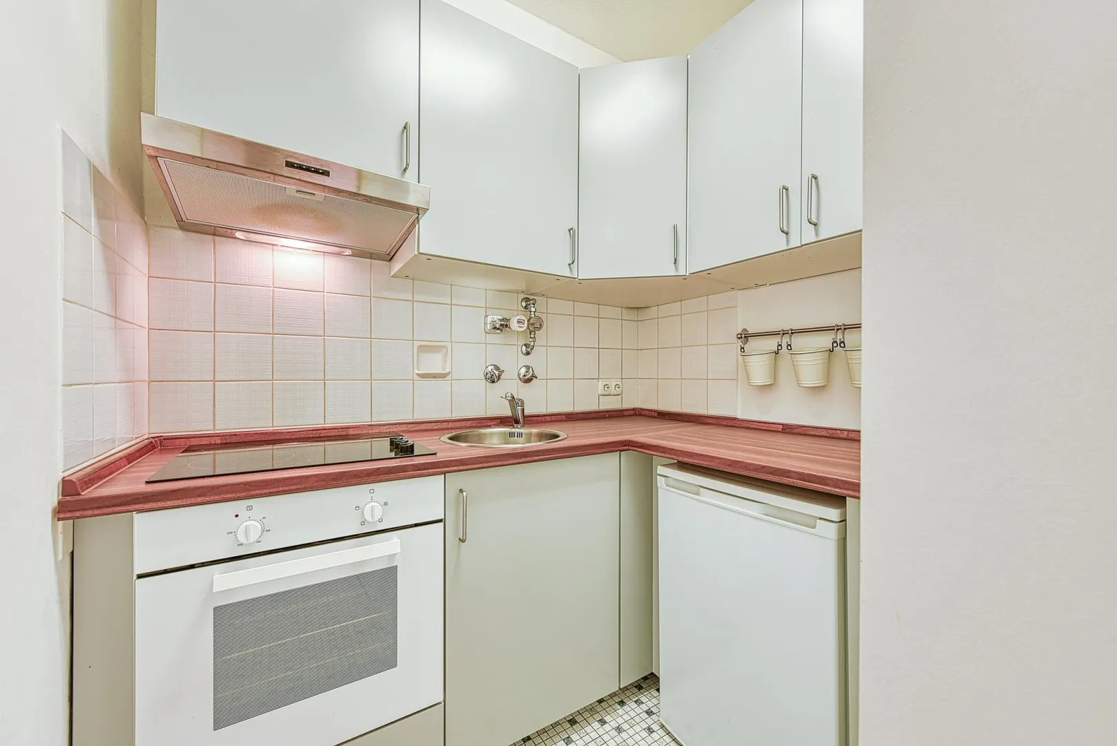 Der Küchenboden ist gefliest. Die Küche ist ausgestattet mit einer Einbauküche. Die Einbauküche ist mit 40 EUR monatlich bereits in der Angabe der Kaltmiete enthalten. Die Küche verfügt über keinen Platz für eine Spülmaschine.