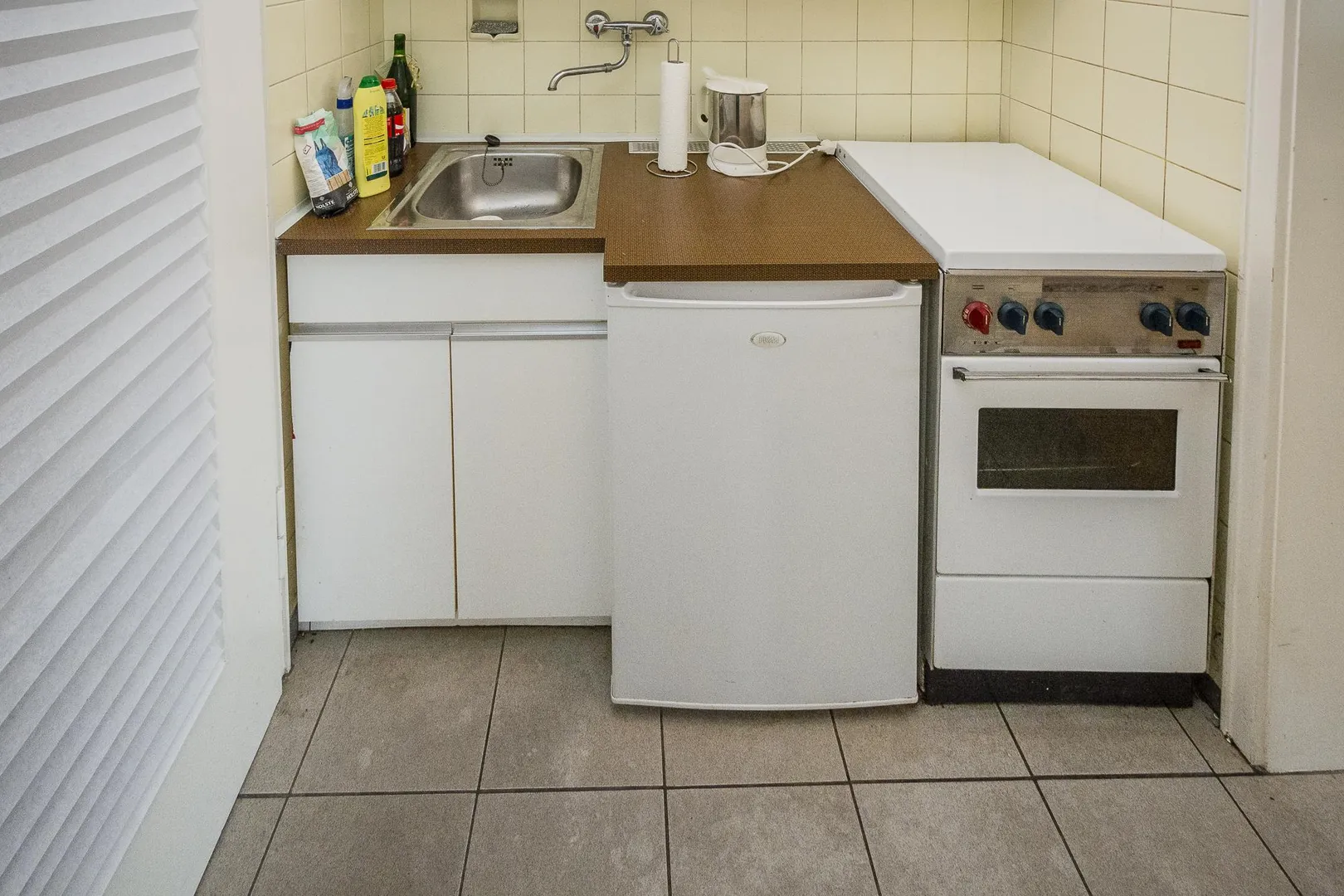 Eine ältere Küchenzeile befindet sich im Flur der Wohnung. Sie beinhaltet einen kleinen Kühl-Gefrierschrank, einen elektrischen Herd mit Backofen sowie Ober- und Unterschränke. Eine Spülmaschine ist nicht vorhanden. Ebenfalls im Flur integriert ist ein Einbauschrank.