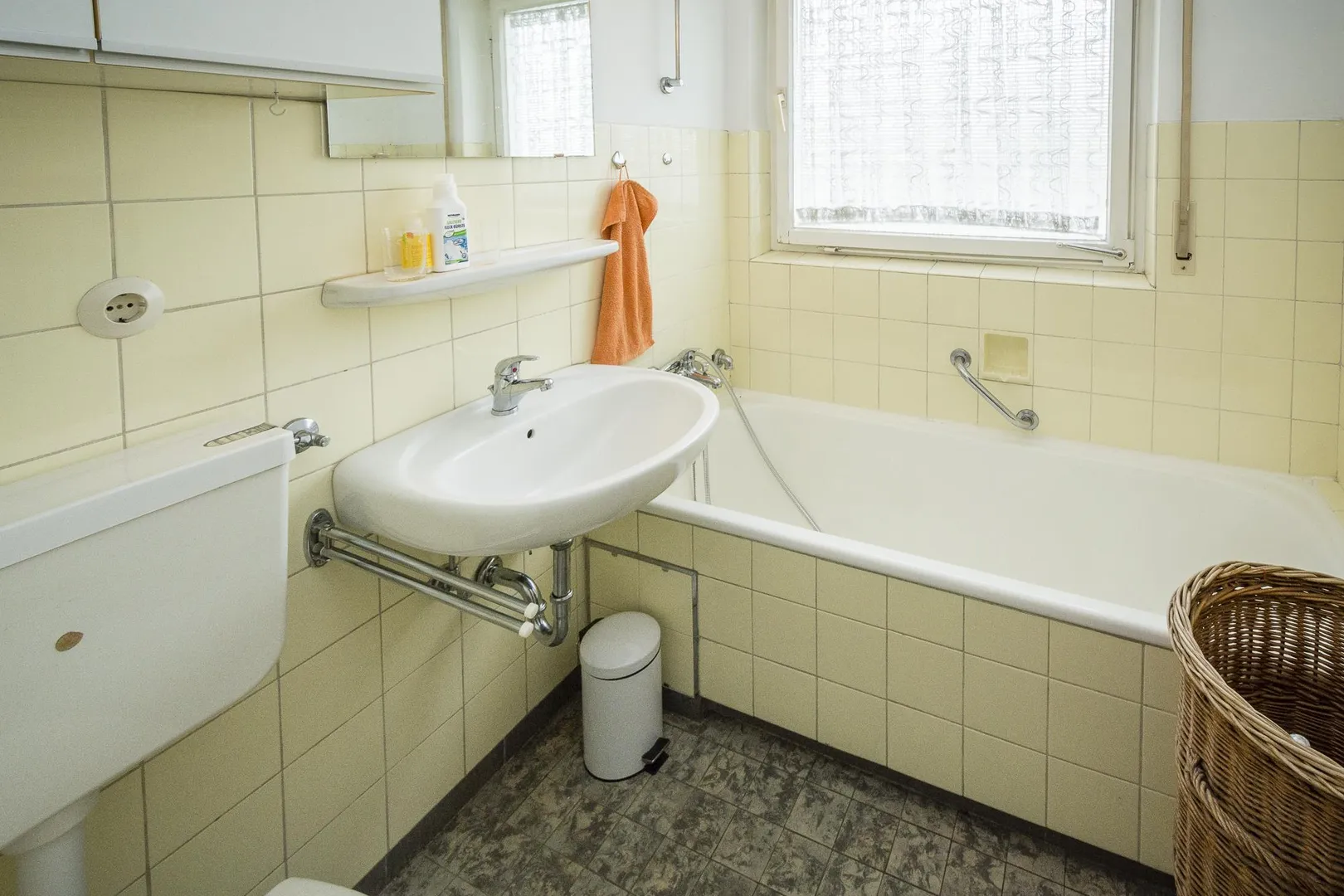 Das ältere, halbhoch geflieste Tageslicht-Badezimmer verfügt über eine Badewanne, ein Waschbecken sowie über ein WC.