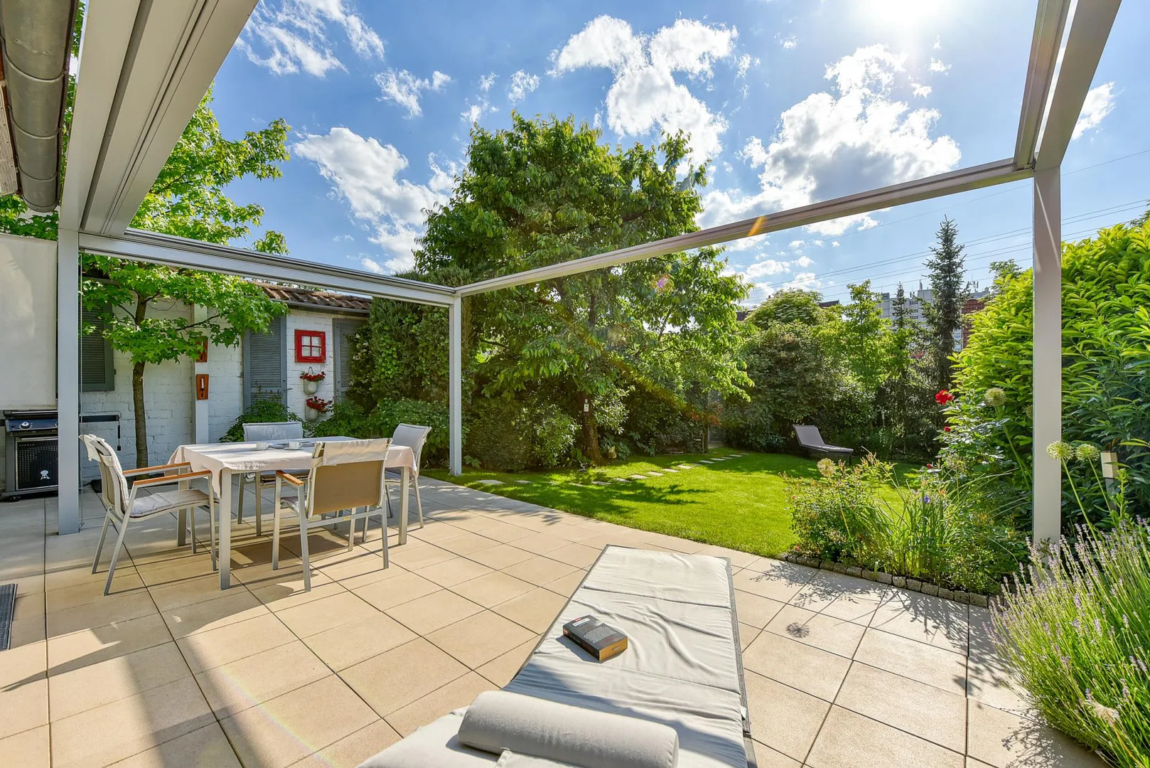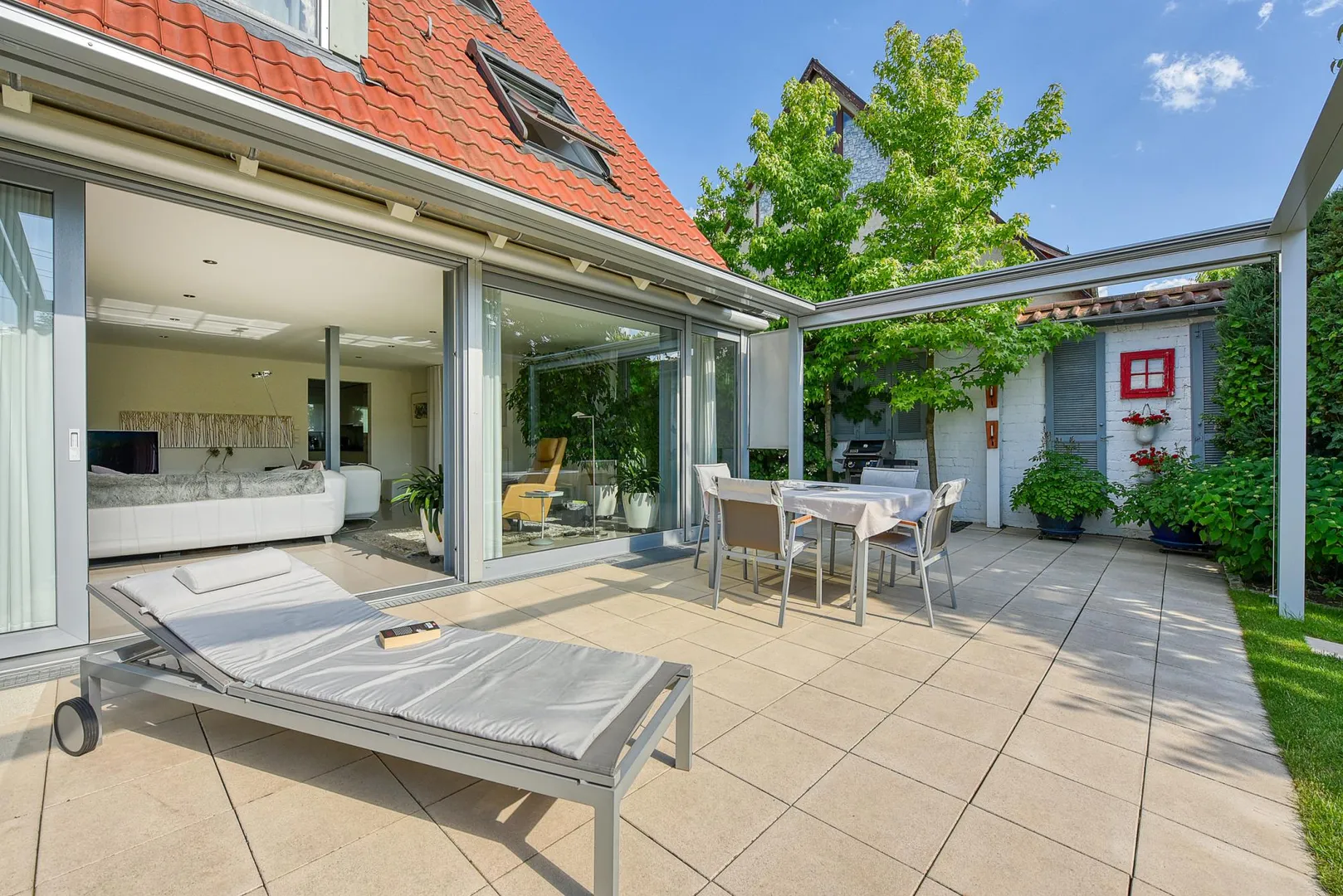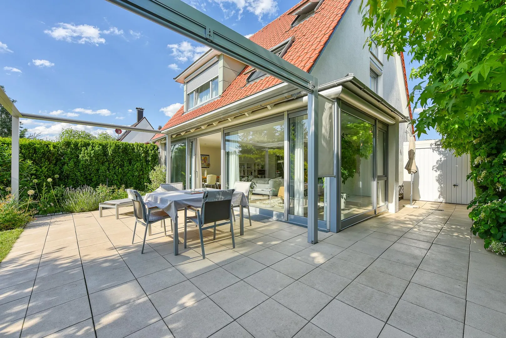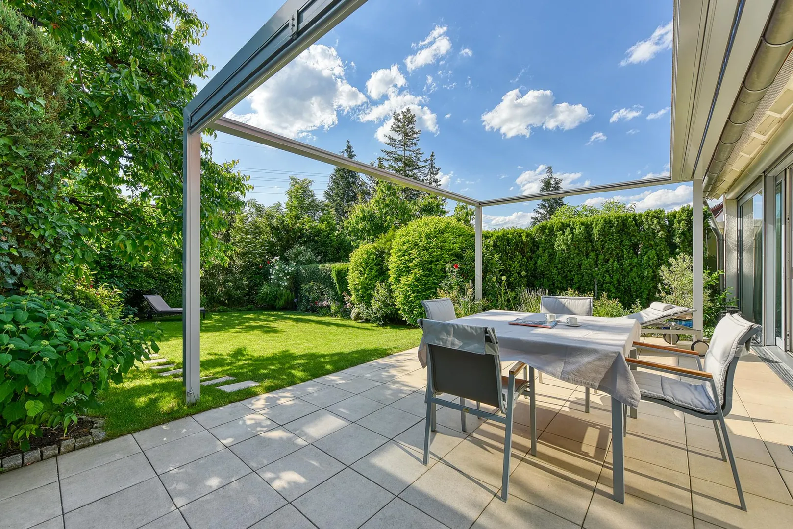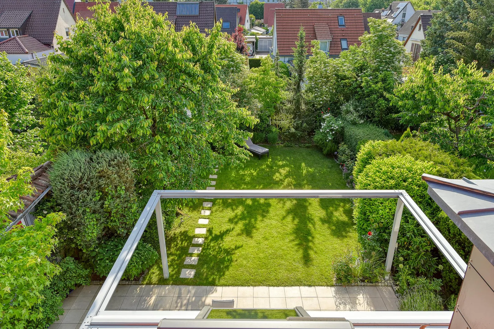 Im Außenbereich befinden sich eine Garage mit 2 Kfz-Stellplätzen davor, die Terrasse sowie der Garten mit einem Geräteschuppen. Die Terrasse ist mit einem hochwertigen Sonnenschutz-System von 2015 ausgestattet. Die Terrasse ist überwiegend nach Westen ausgerichtet und verfügt über ca. 50 m². In der Wohnflächenberechnung ist die Terrasse mit einem Drittel berücksichtigt.