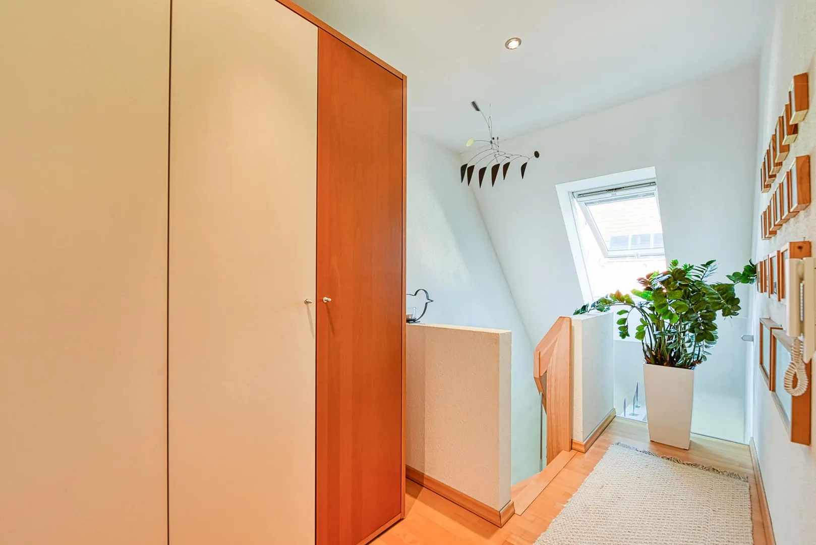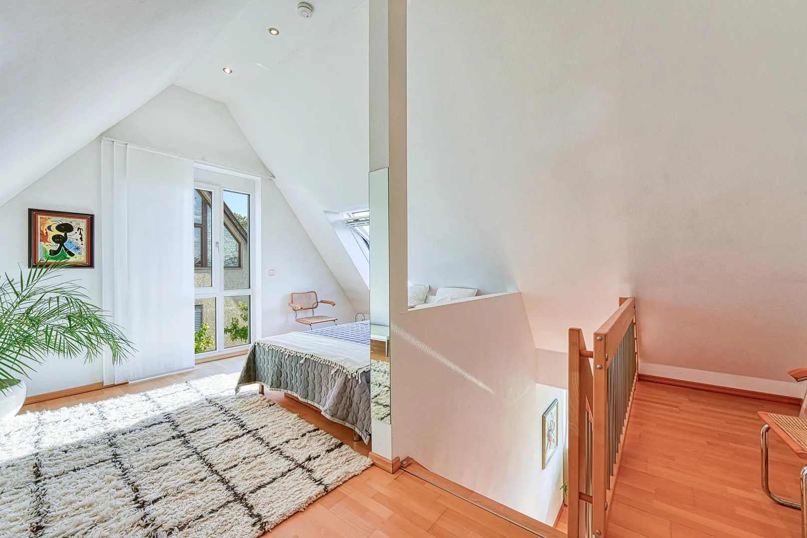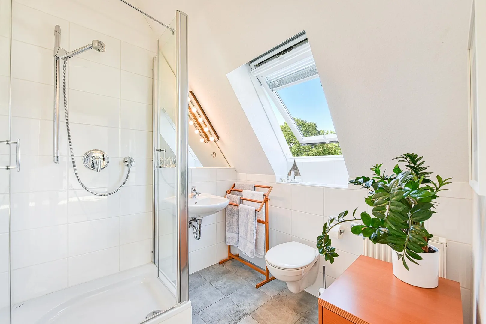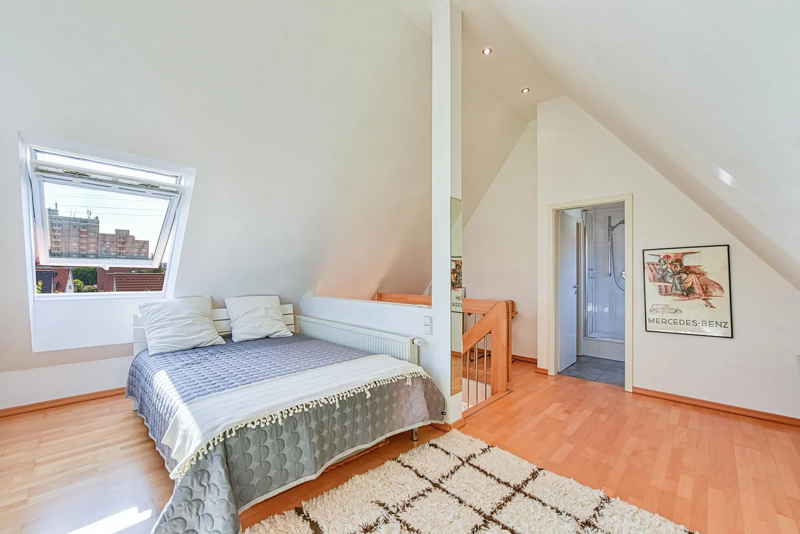 Im Dachgeschoss, auf ca. 50 m² Wohnfläche nach DIN, befinden sich das Schlafzimmer mit Ankleide, ein Badezimmer mit Fenster sowie das Kinderzimmer mit Aufgang ins Studio. Die Böden im Flur sowie in den Zimmern sind mit Parkett ausgestattet. Das Tageslicht-Badezimmer ist gefliest und ist ausgestattet mit einer Badewanne, einer Dusche, einem WC sowie einem Handtuch-Heizkörper. Die Decken sind abgehängt und mit Halogenlampen ausgestattet. Die Raumhöhen betragen ca. 2,41 Meter.