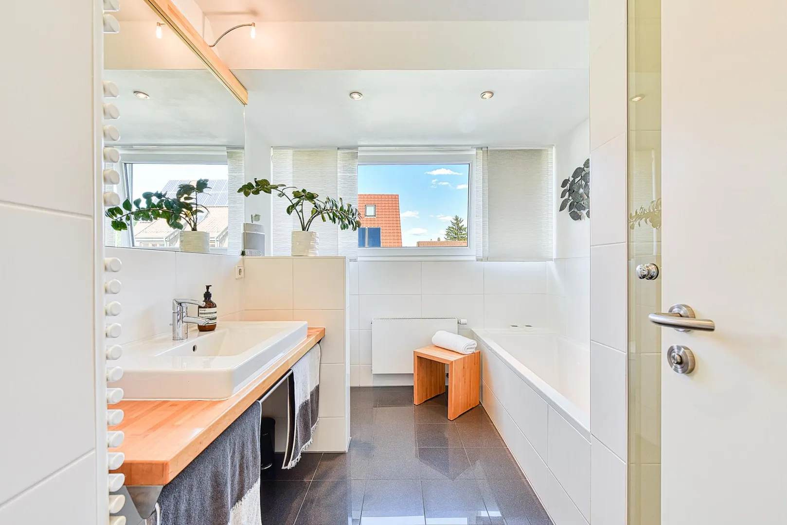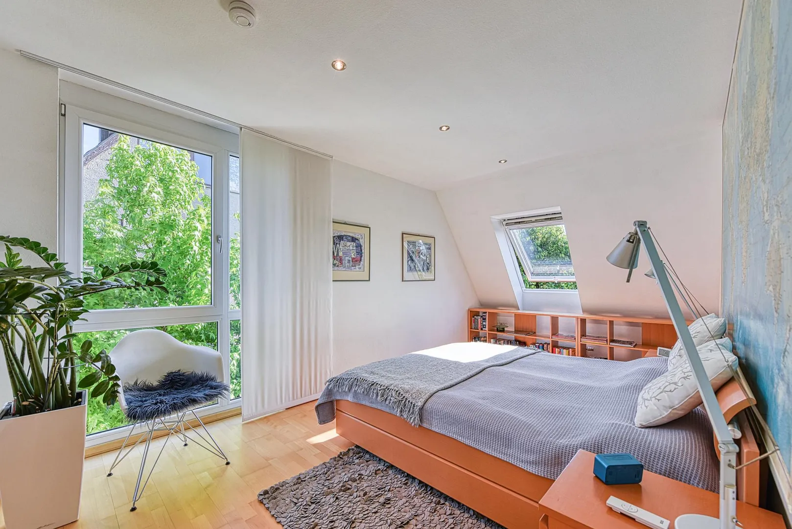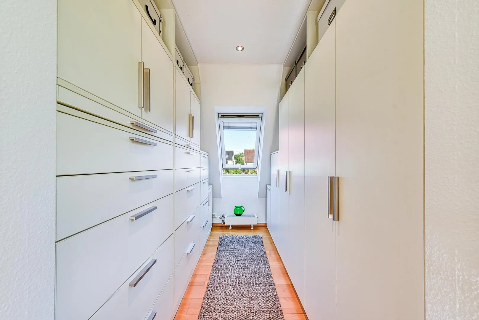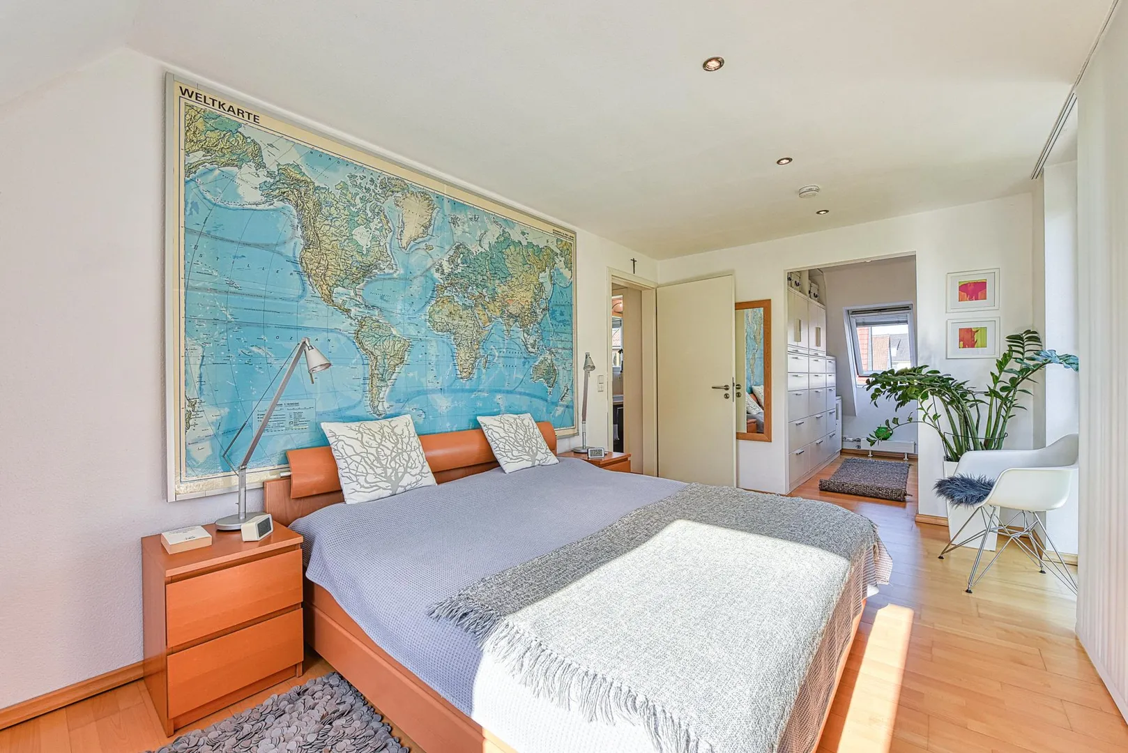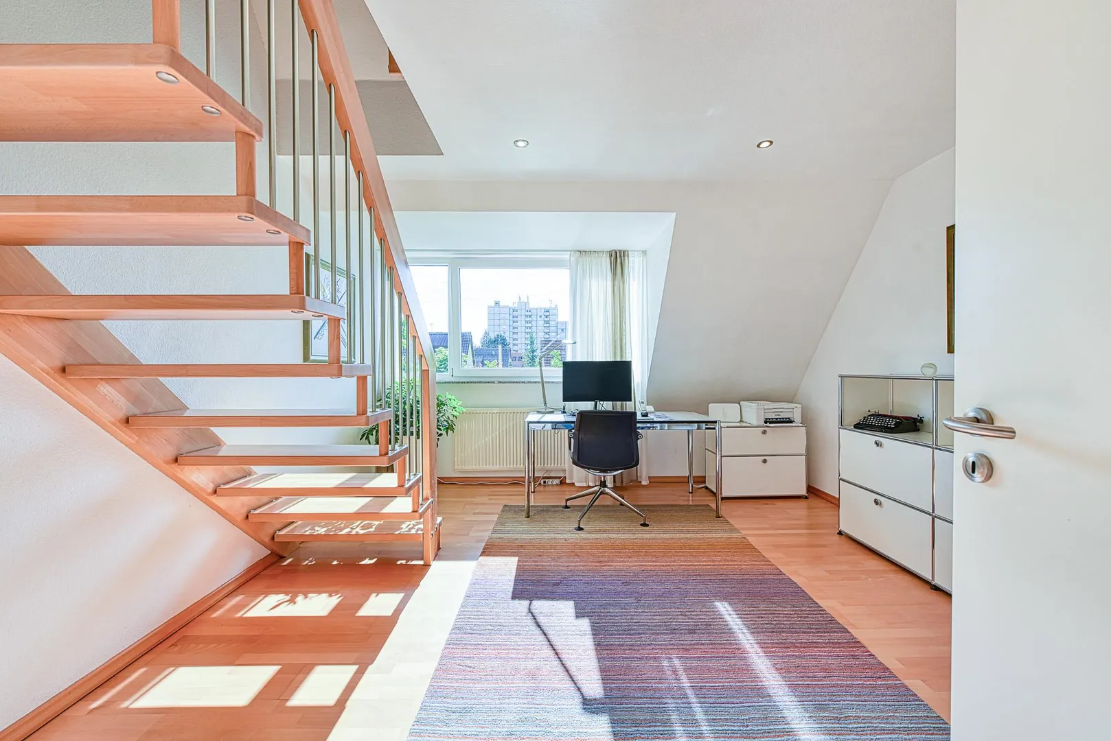 Im Dachgeschoss, auf ca. 50 m² Wohnfläche nach DIN, befinden sich das Schlafzimmer mit Ankleide, ein Badezimmer mit Fenster sowie das Kinderzimmer mit Aufgang ins Studio. Die Böden im Flur sowie in den Zimmern sind mit Parkett ausgestattet. Das Tageslicht-Badezimmer ist gefliest und ist ausgestattet mit einer Badewanne, einer Dusche, einem WC sowie einem Handtuch-Heizkörper. Die Decken sind abgehängt und mit Halogenlampen ausgestattet. Die Raumhöhen betragen ca. 2,41 Meter.