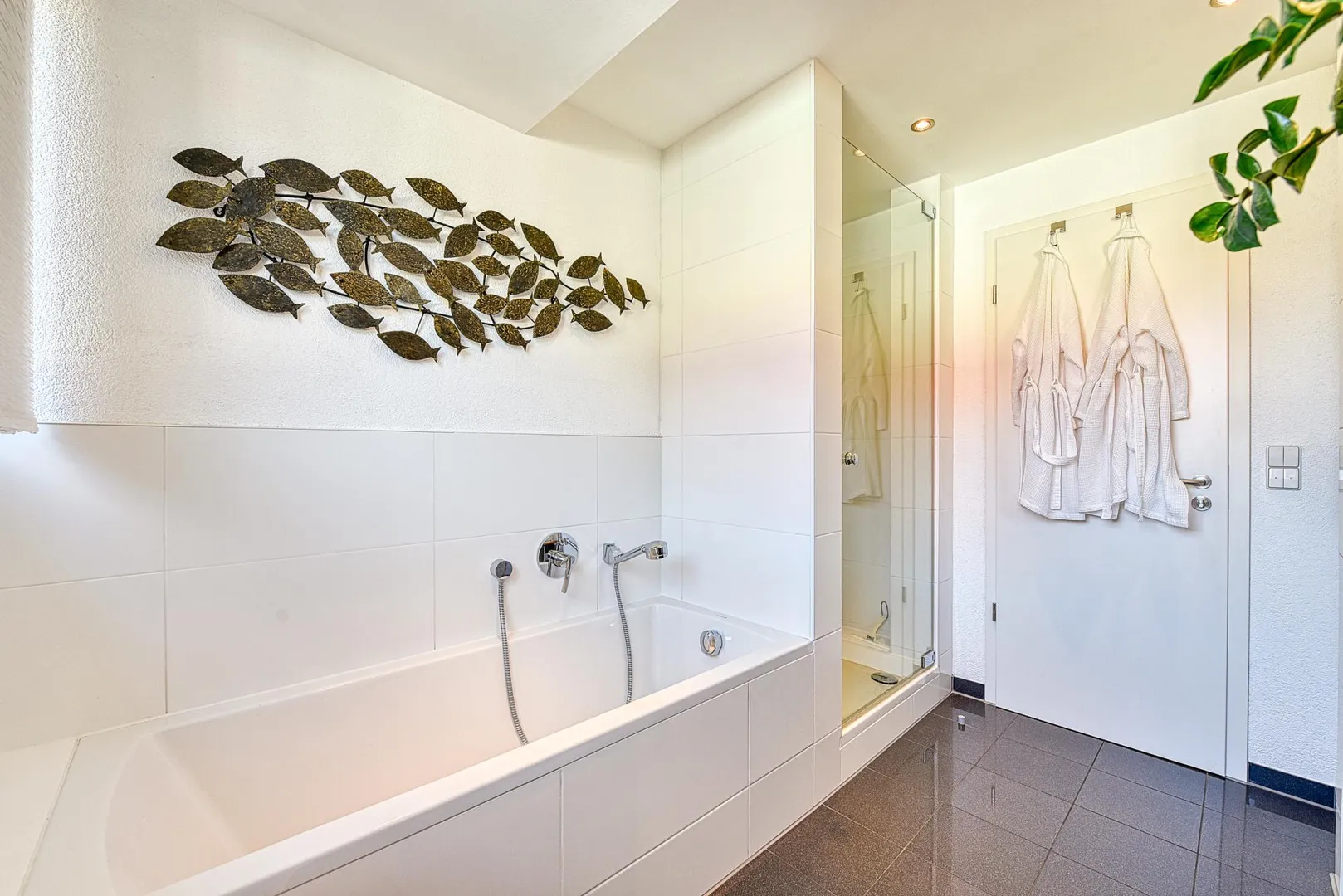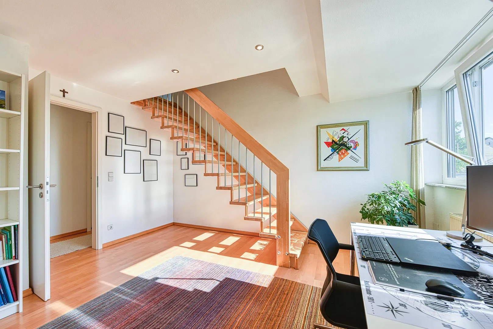 Im Studio, auf ca. 21 m² Wohnfläche nach DIN, befinden sich ein zweites Badezimmer mit Fenster sowie der Heizungsraum. Im Studio ist Parkett verlegt. Das geflieste Tageslicht-Badezimmer ist ausgestattet mit einer Dusche sowie einem WC. Die maximale Raumhöhe im Studio beträgt 3,30 Meter.