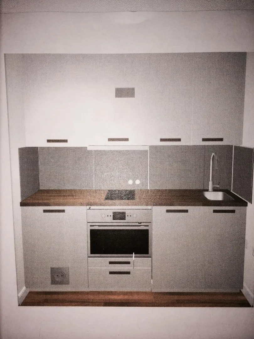 Eine neue Küchenzeile wird vom Vermieter eingebaut. Die Einbauküche ist ausgestattet mit einem Kühlschrank mit Gefrierfach, einer kleinen Spülmaschine, einem Induktionsherd mit 3 Kochplatten, einem Backofen mit Mikro-/Grillfunktion, einem Dunstabzug sowie Unter- und Oberschränken.
