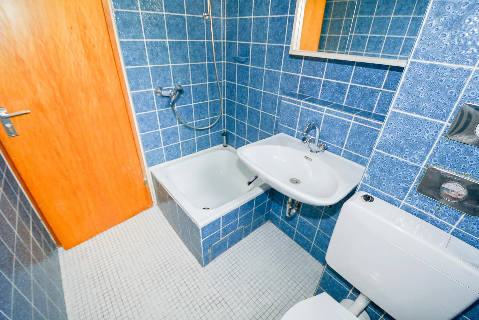 Das raumhoch geflieste Tageslicht-Badezimmer aus dem Ursprungsbaujahr ist ausgestattet mit einem Fliesenboden, einer Dusche, einem WC sowie einem Waschbecken. Es gibt weder einen gemeinschaftlichen Waschraum noch einen Waschmaschinenabstellplatz in der Wohnung. Die Wäsche muss außerhalb des Hauses, z.B. im Wasch-Salon, gewaschen werden.