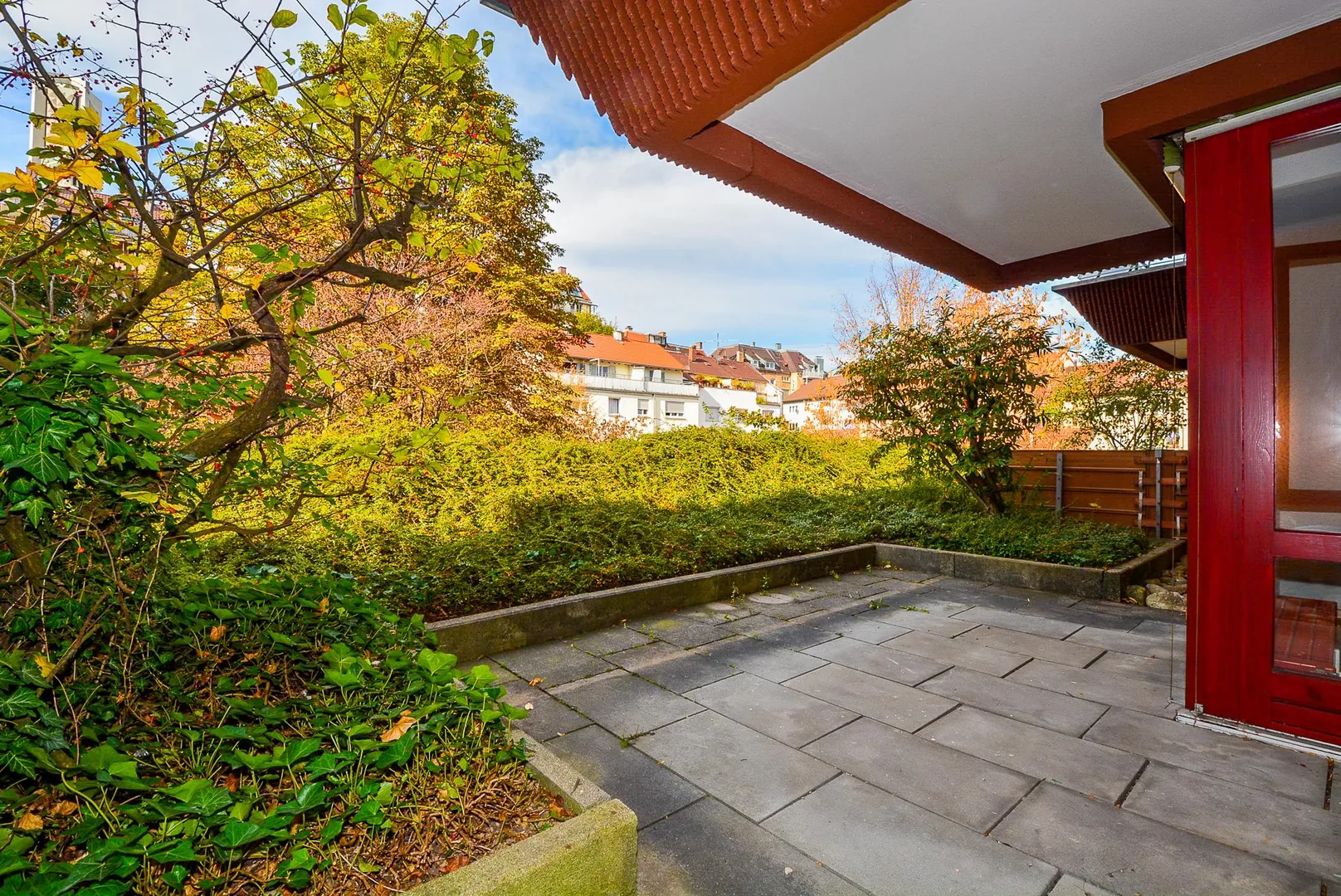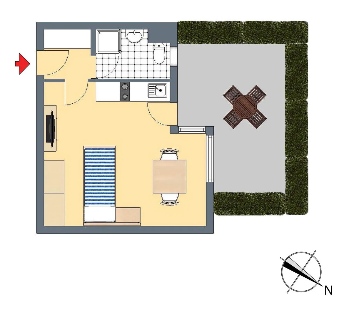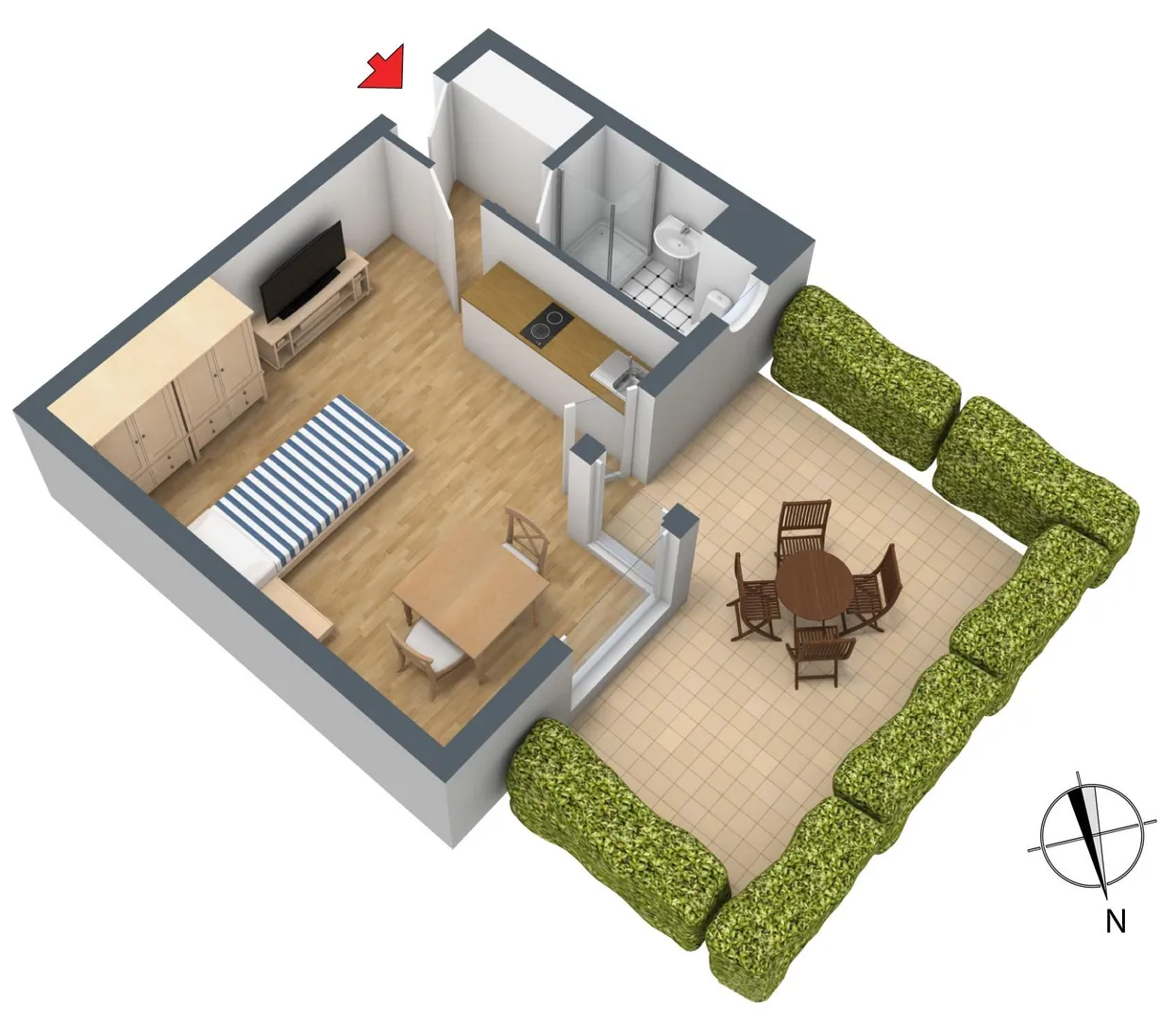 Vom Zimmer ist die ca. 9,5 m² große und teilüberdachte Nordwest-Terrasse begehbar.