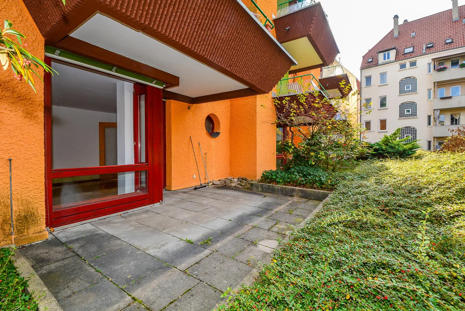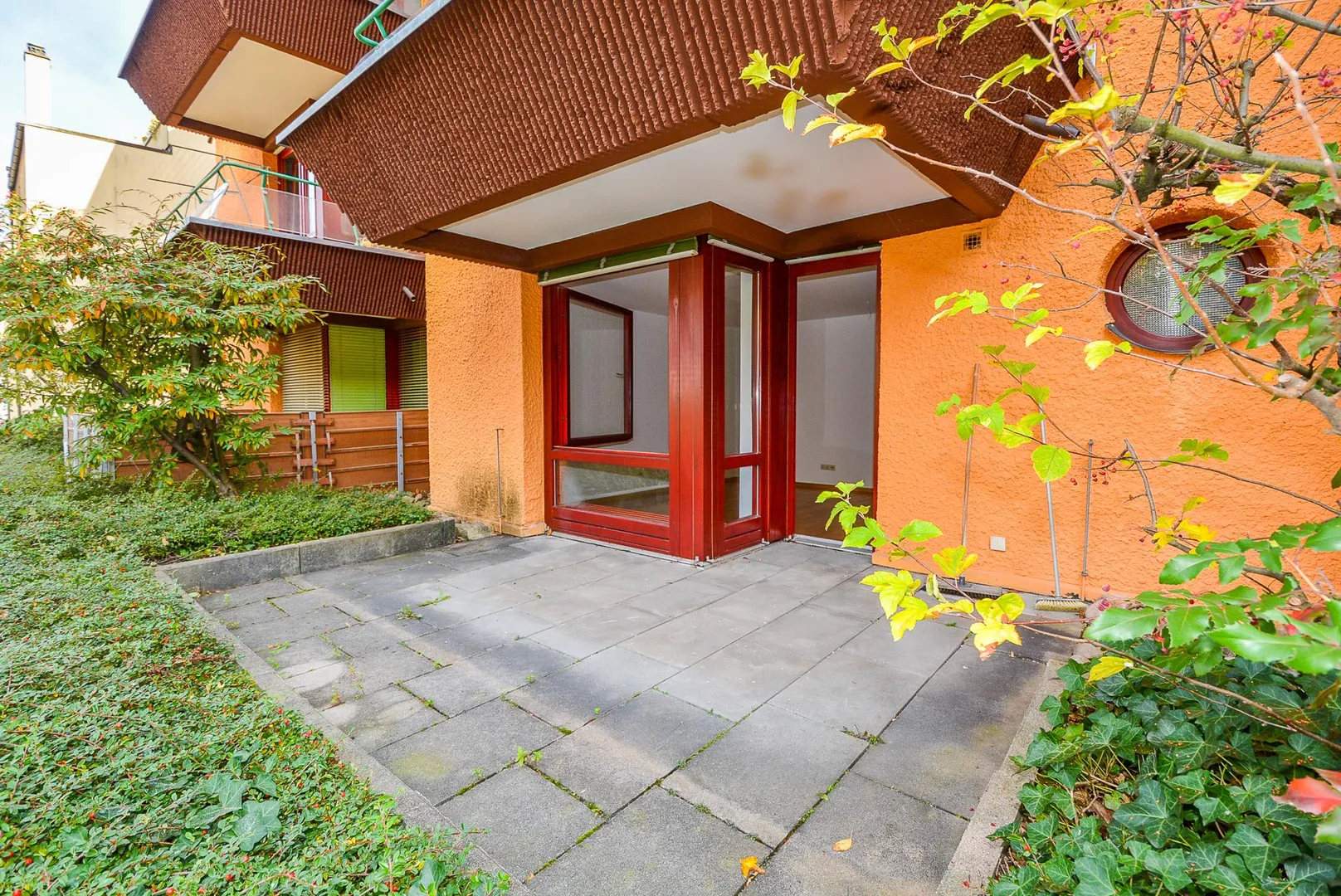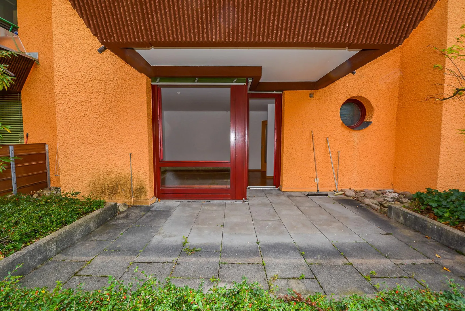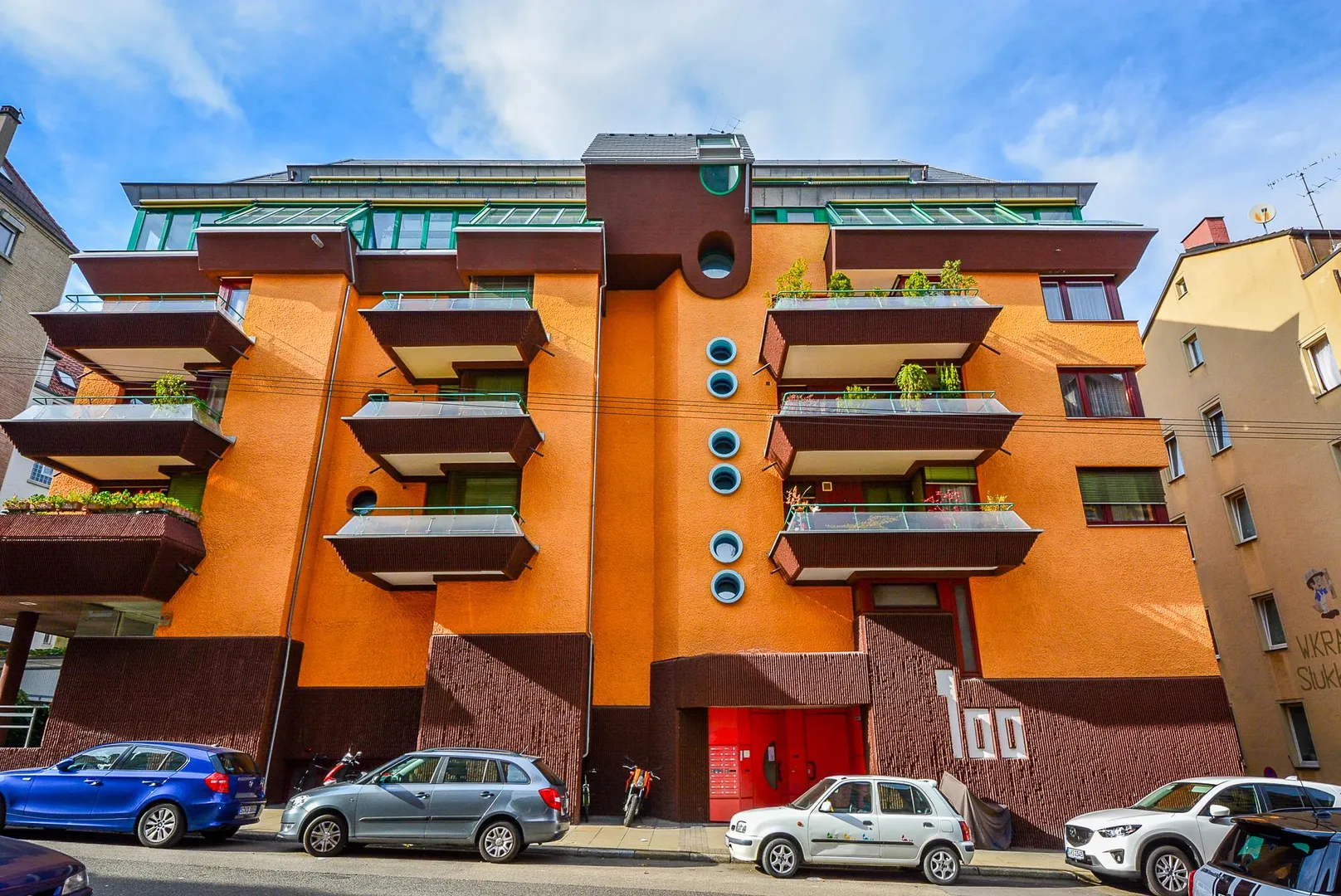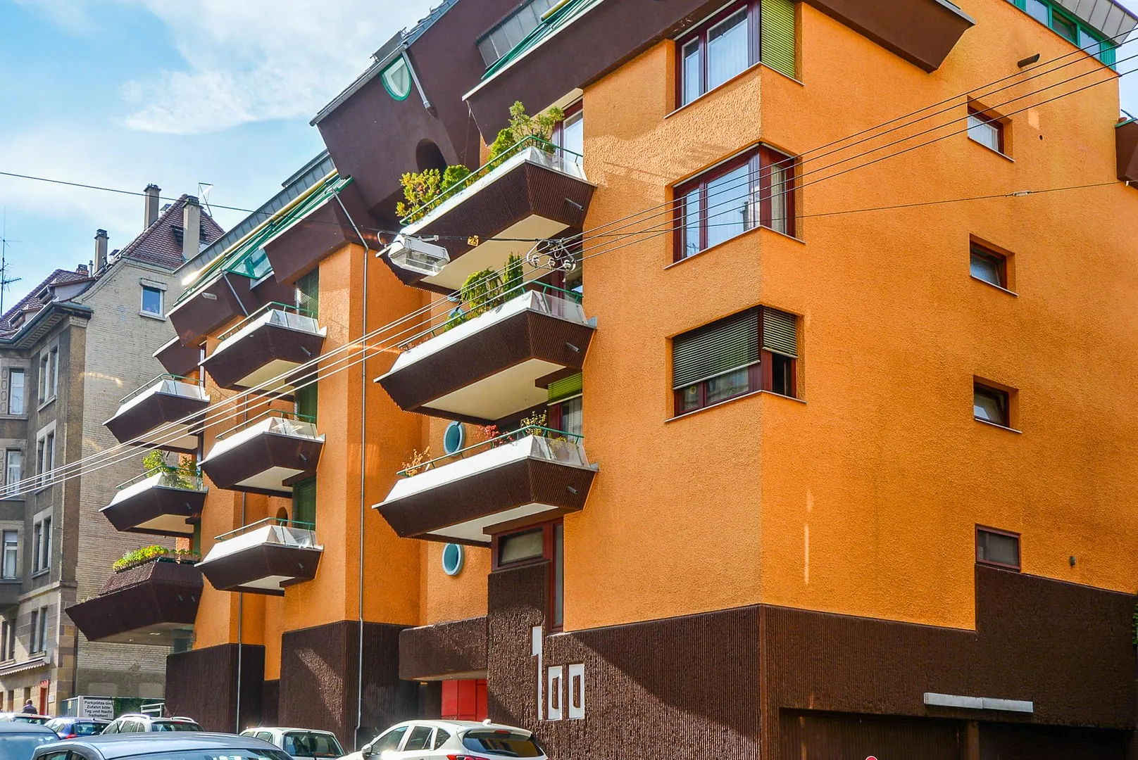 Das Haus wurde in auffallend besonderer Architektur und Farbgebung ca. 1978, massiv, 4-geschossig, vollunterkellert sowie mit Walmdach erstellt.
