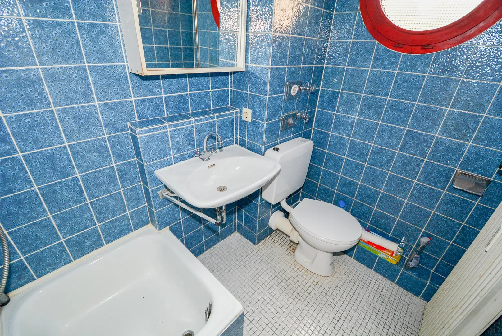 Das raumhoch geflieste Tageslicht-Badezimmer aus dem Ursprungsbaujahr ist ausgestattet mit einem Fliesenboden, einer Dusche, einem WC sowie einem Waschbecken.