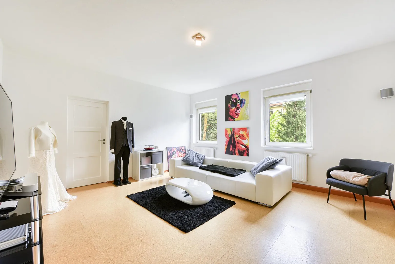 Diese modernisierte 5-Zimmer-Wohnung ohne Balkon befindet sich im Hochparterre (Erdgeschoss) eines 6-Familienhauses.