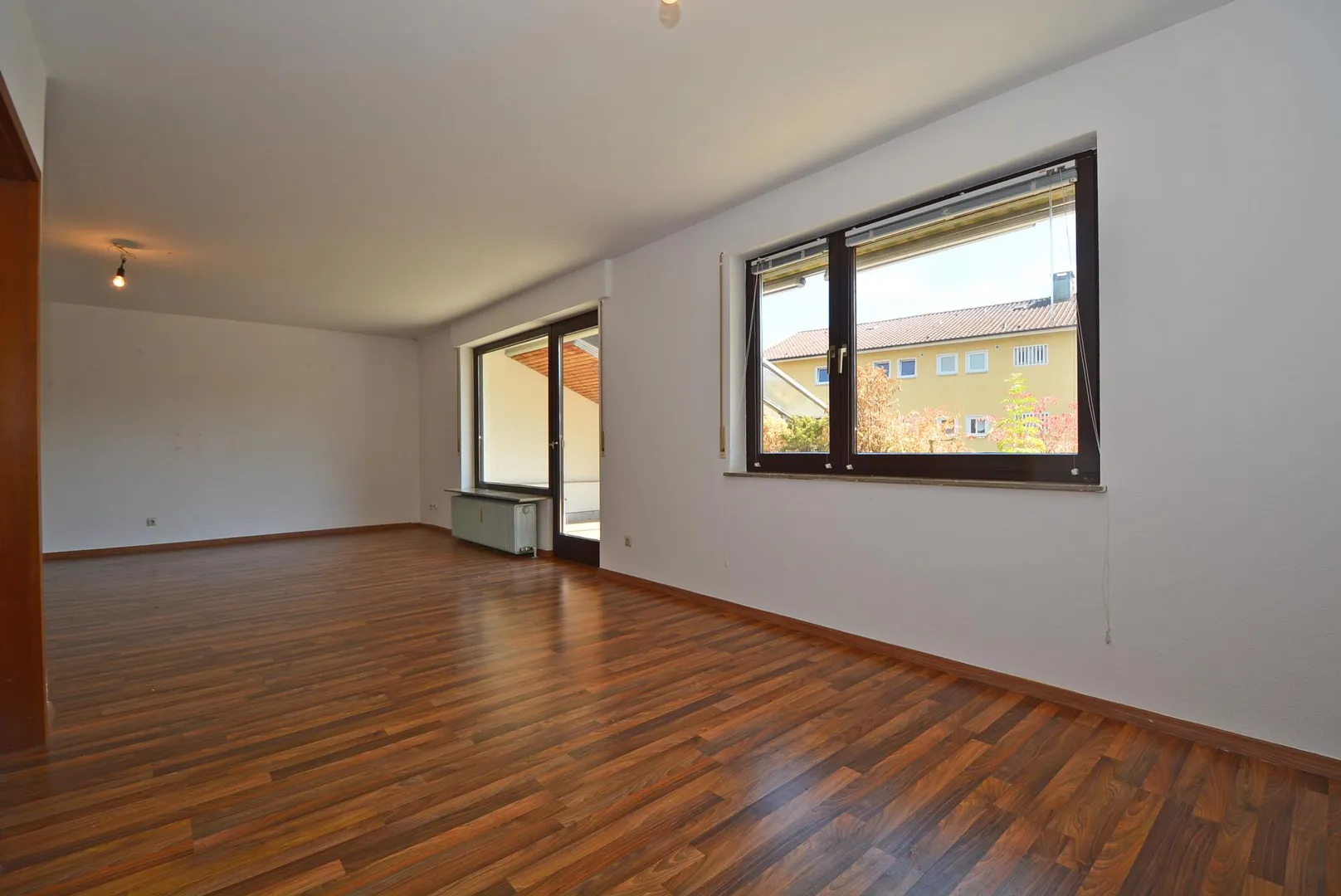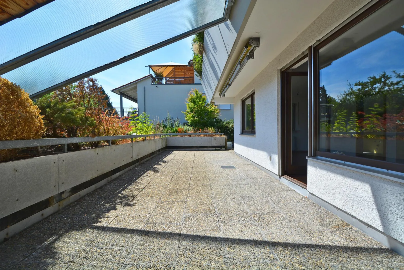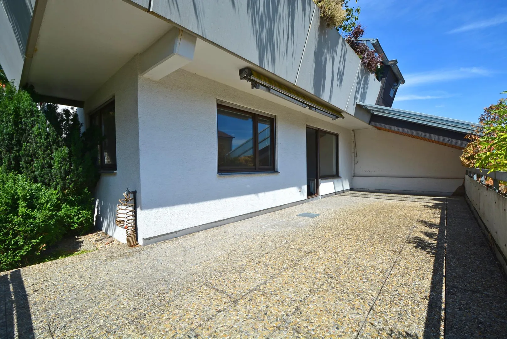 Die ca. 38 m² große und teilüberdachte Süd-Terrasse ist vom offenen Wohn-/Essbereich begehbar und mit einer Markise ausgestattet.