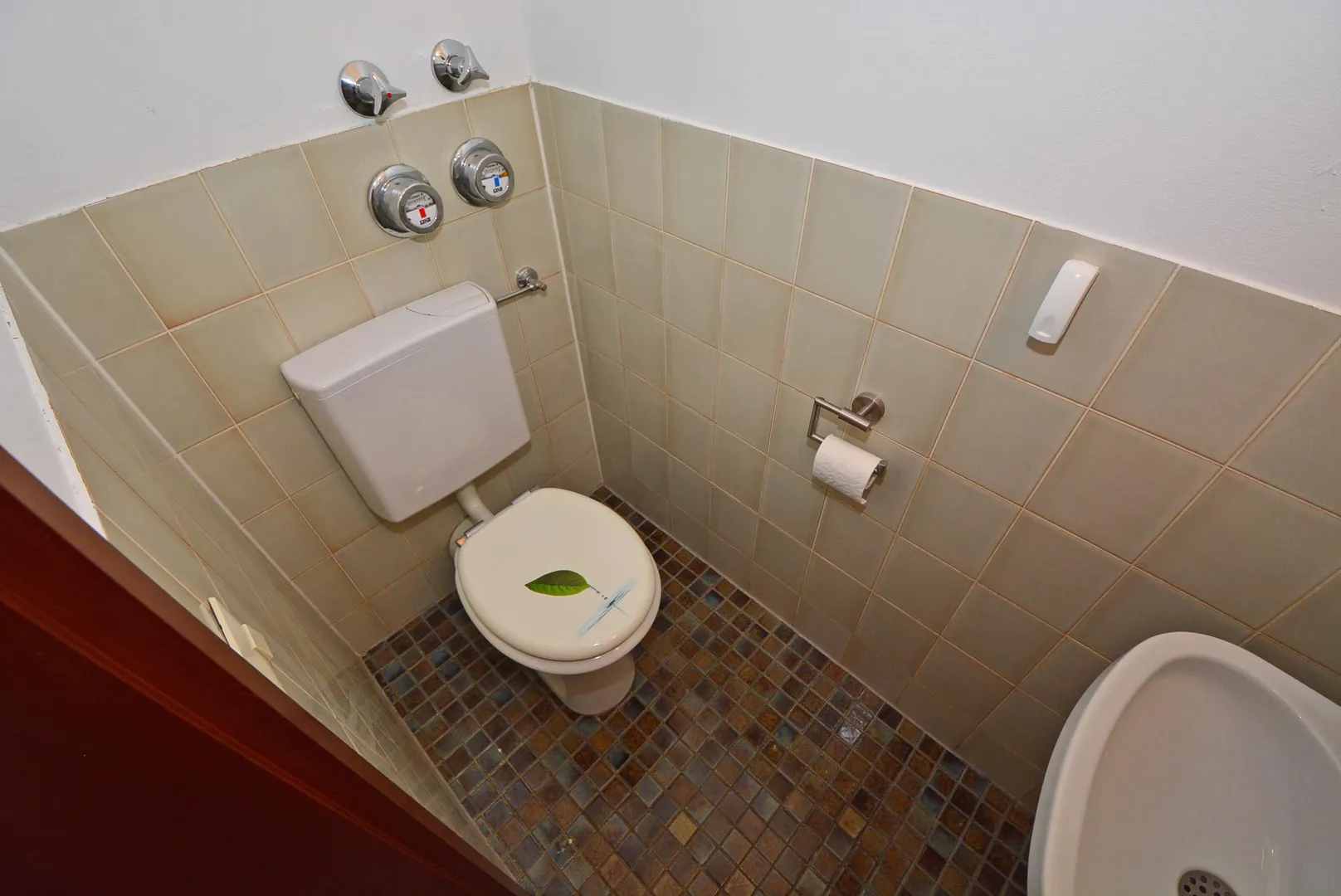 Das halbhoch geflieste Badezimmer aus dem Ursprungsbaujahr ist mit einer Badewanne, einer Dusche sowie einem Waschbecken ausgestattet.