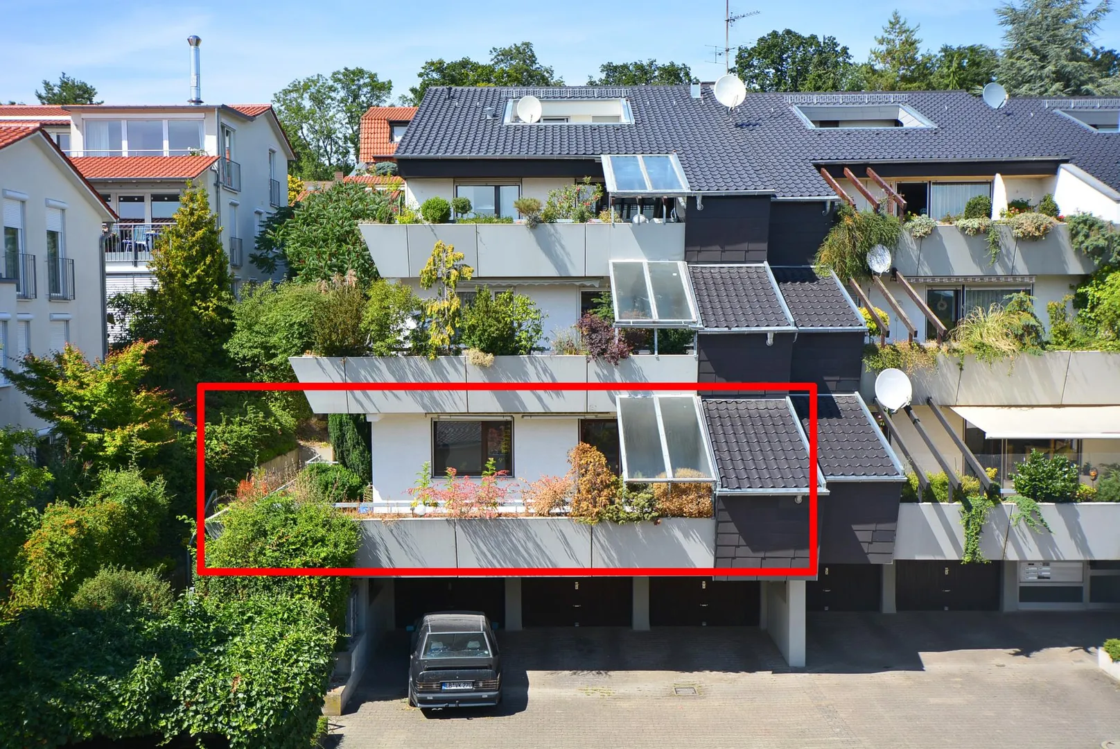 Zur Wohnung gehören ein Abstellraum im Untergeschoss sowie eine Garage mit Stellplatz davor.