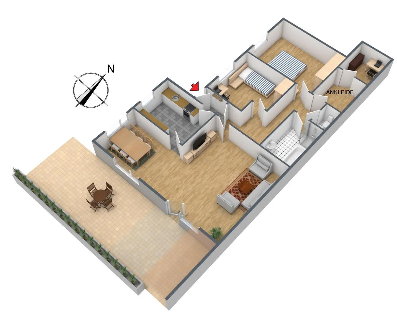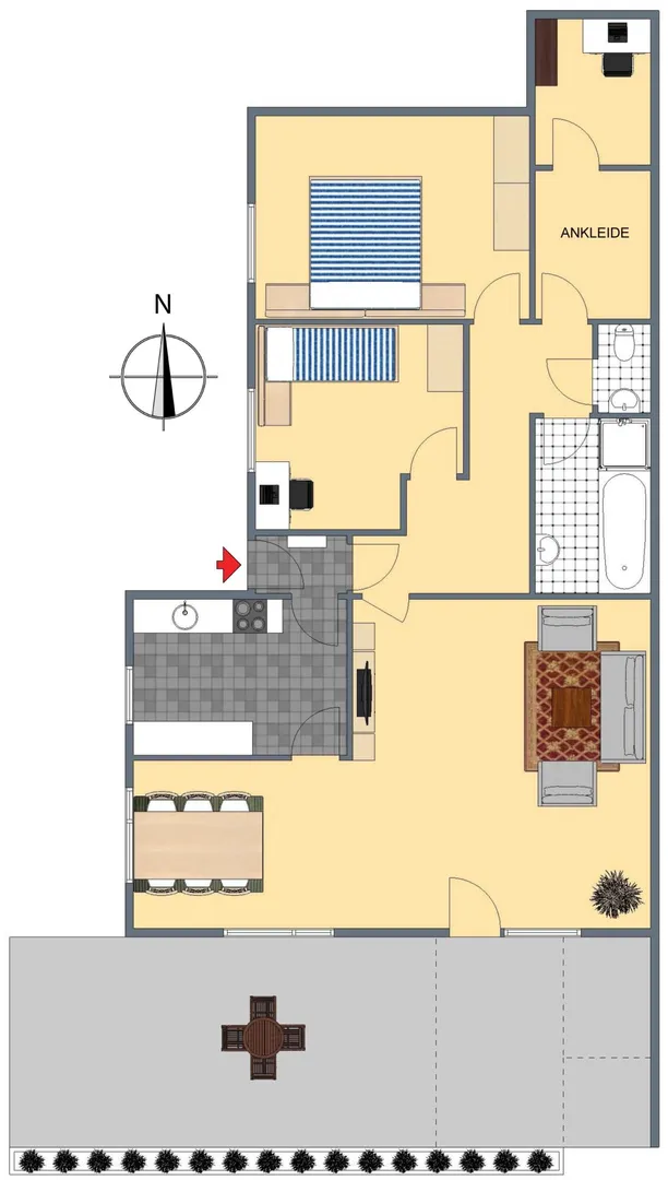 Alle Räume sind vom Flur aus begehbar. Die Küche bietet einen direkten Zugang zum Essbereich. Das WC ist separat.