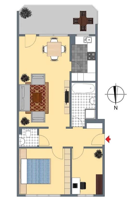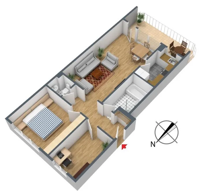 Das offene Wohn-/Esszimmer und die Küche sind nach Süden ausgerichtet, das Schlafzimmer und das Arbeitszimmer sind nach Norden ausgerichtet.