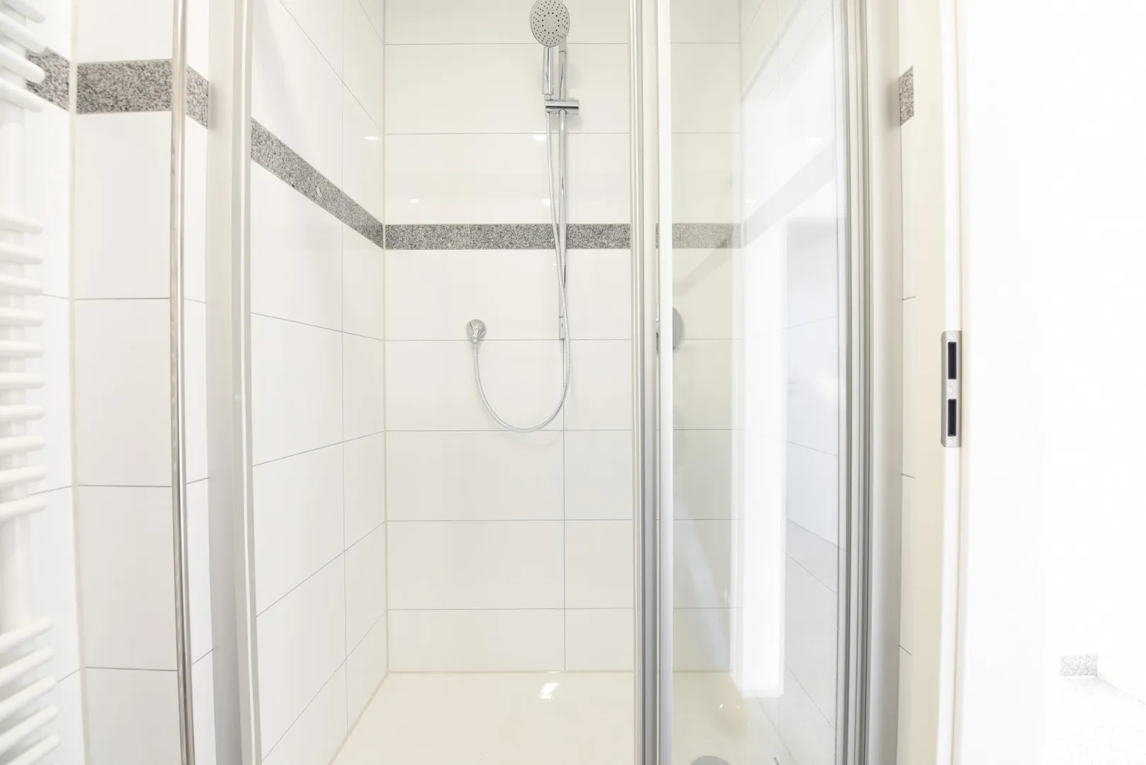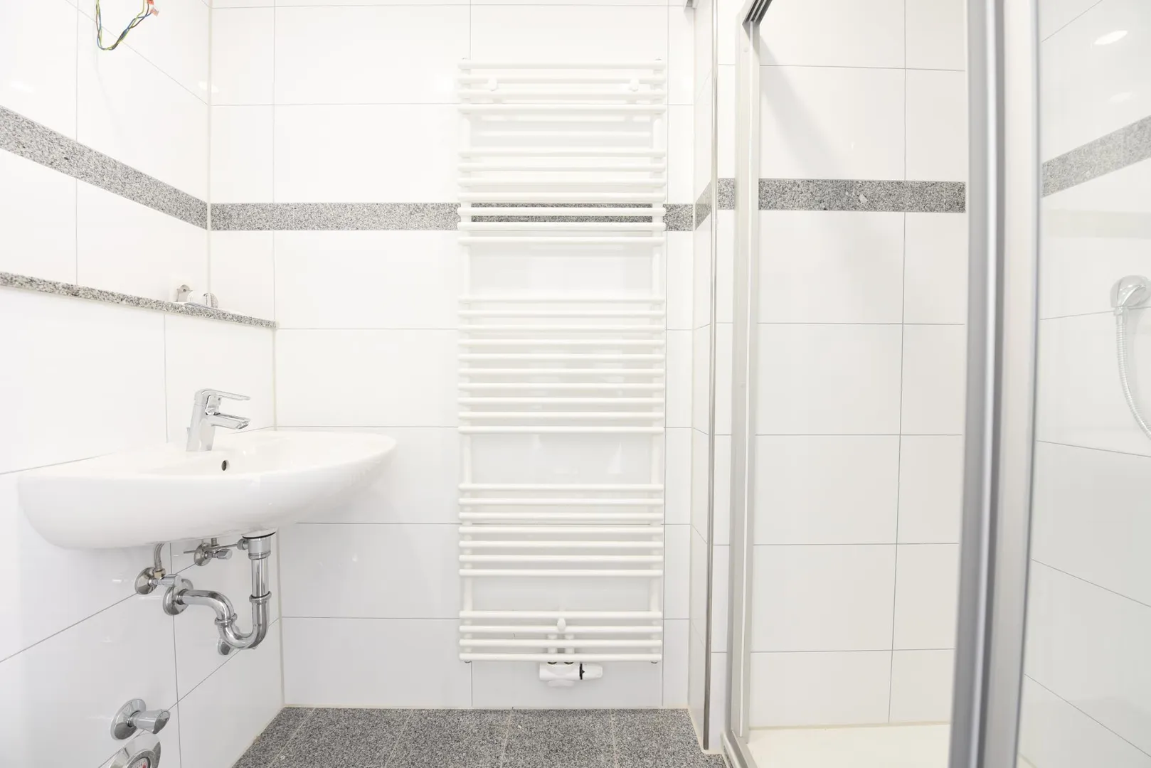 Das raumhoch geflieste Badezimmer ist mit einer Dusche, einem WC sowie einem Handtuch-Heizkörper ausgestattet.