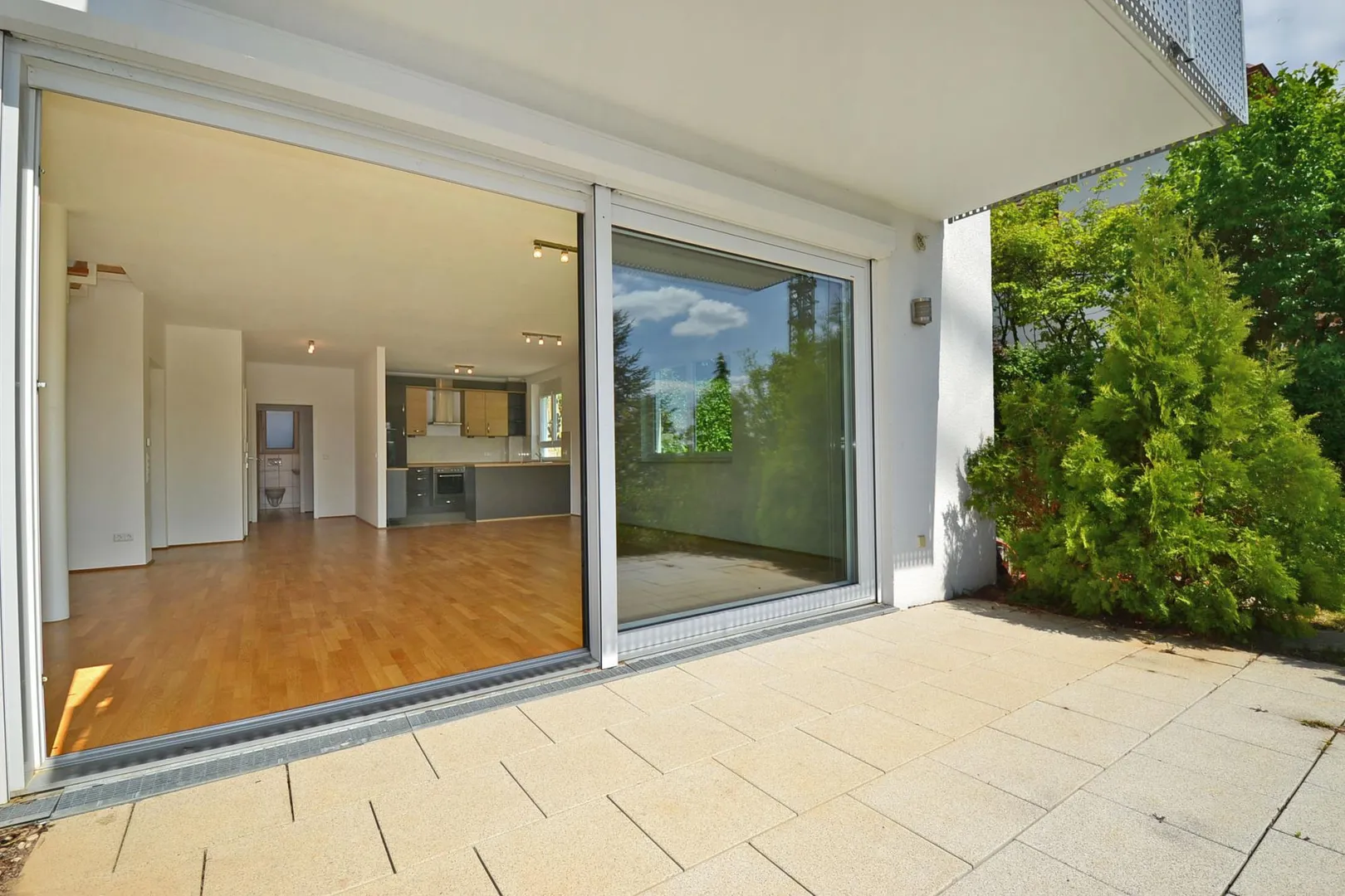 Der offene Wohnbereich ist durch die bodentiefe Terrassentüre sonnig hell.