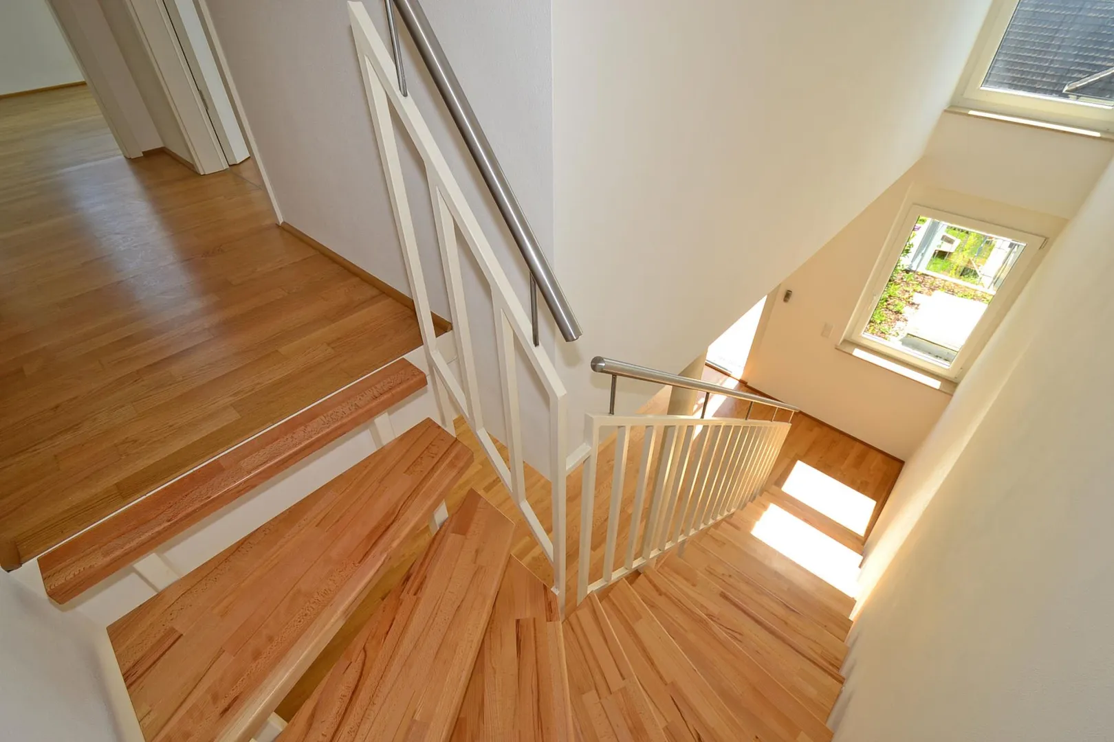 Über einen Treppenaufgang gelangen Sie vom Wohnbereich zum Obergeschoss.