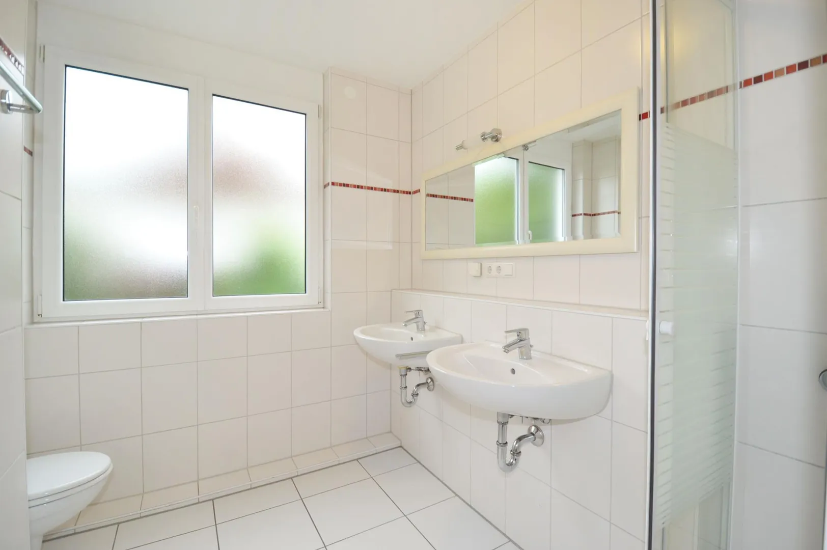 Das separate zweite Bad ist mit Dusche, 2 Waschbecken, WC und Fenster ausgestattet.