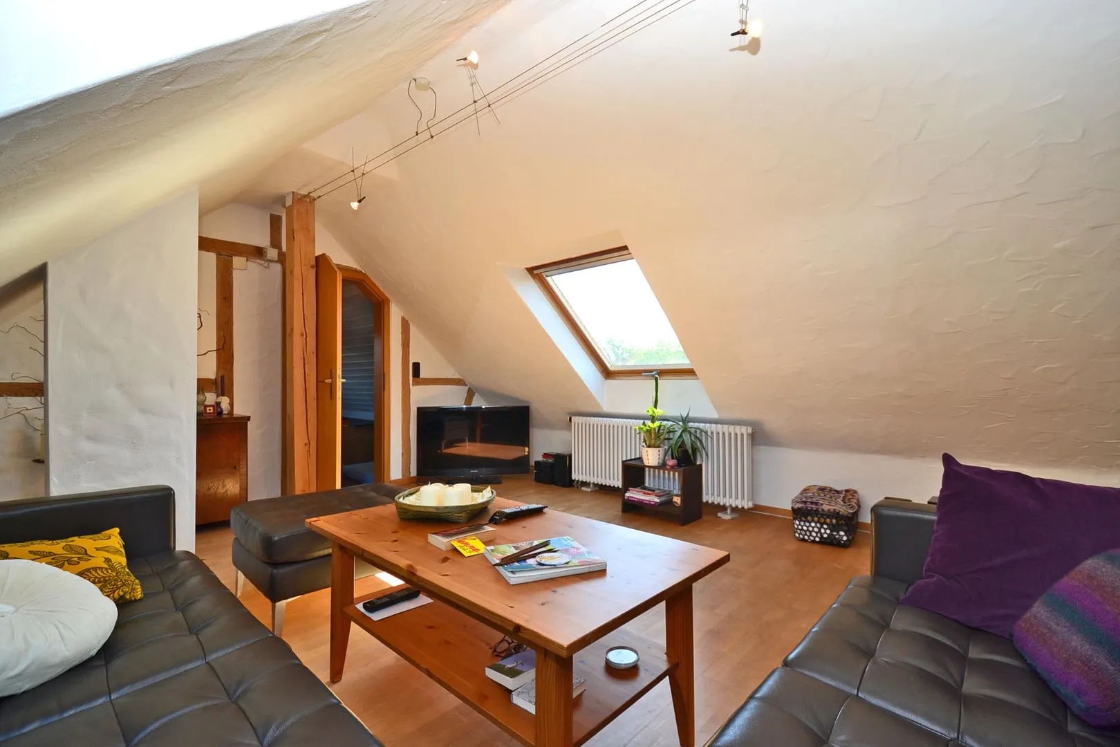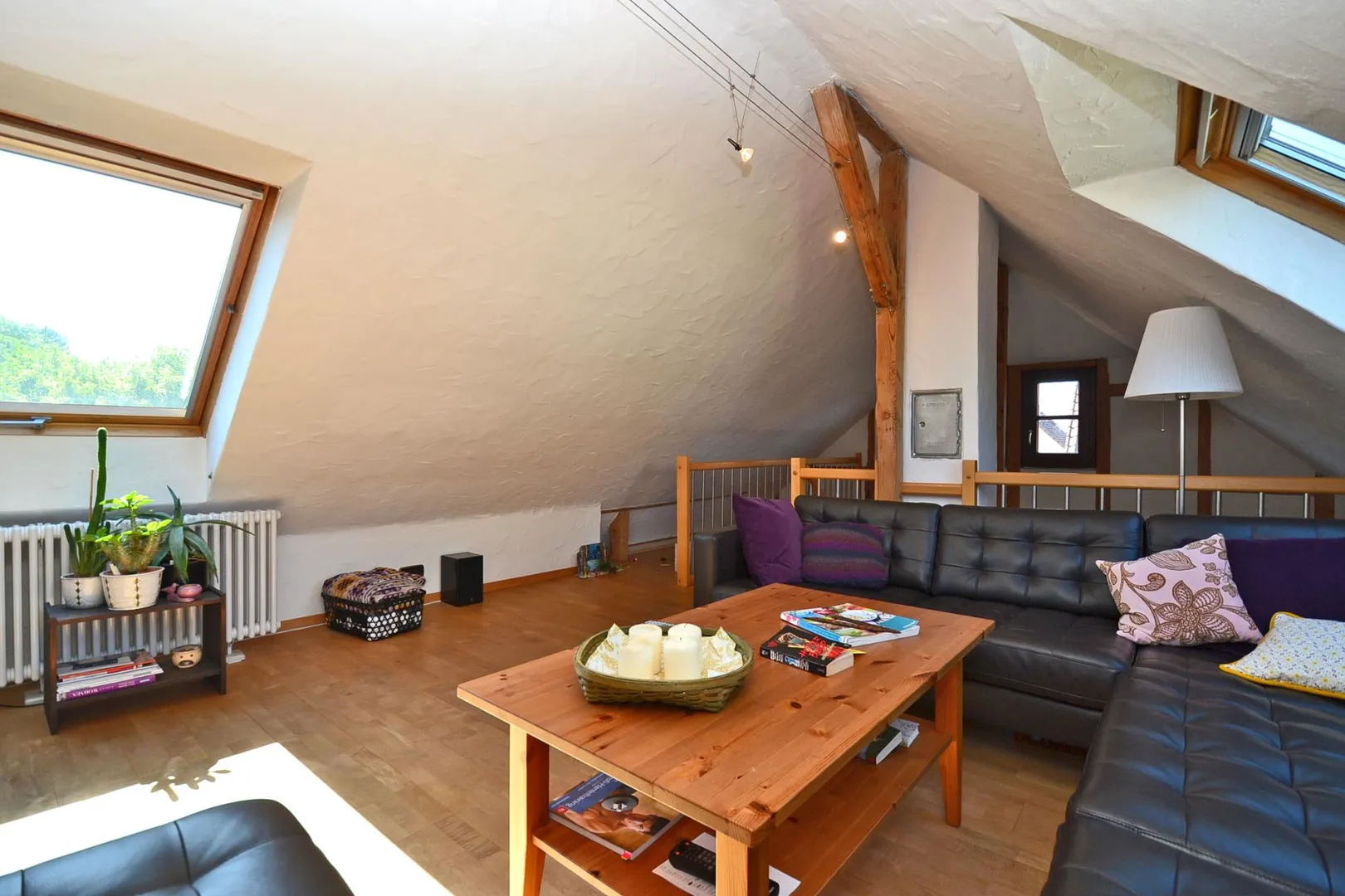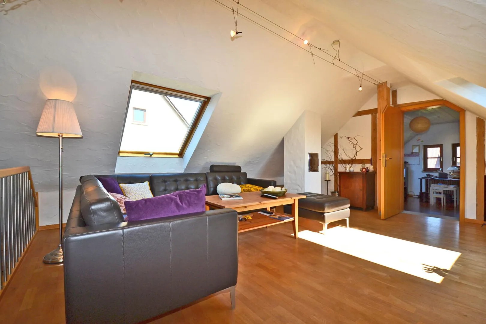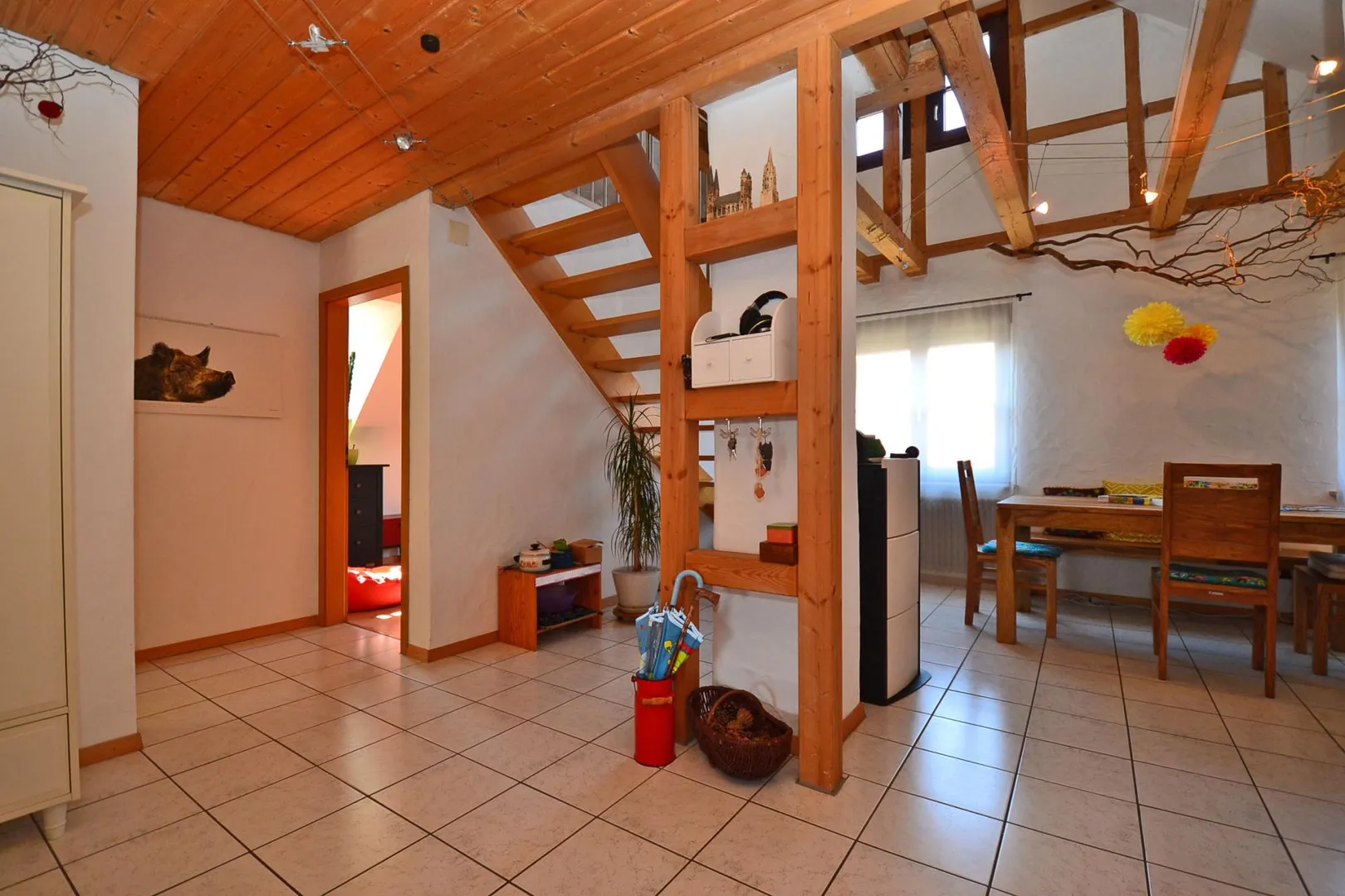 Diese individuell und offen gestaltete 4½-Zi.-Maisonette-Wohnung befindet sich im 1. und im 2. Obergeschoss (Dachgeschoss mit Schrägen) eines 2-Familienhauses.