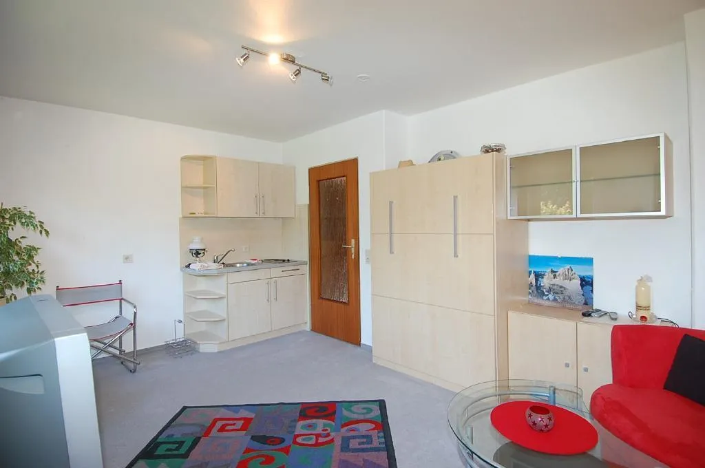 Die Wohnung ist komplett möbliert, u.a. mit Kleiderschrank, Bett, Sofa, Couchtisch, Stühlen, TV-Gerät und Kühl-/Gefrierschrank.