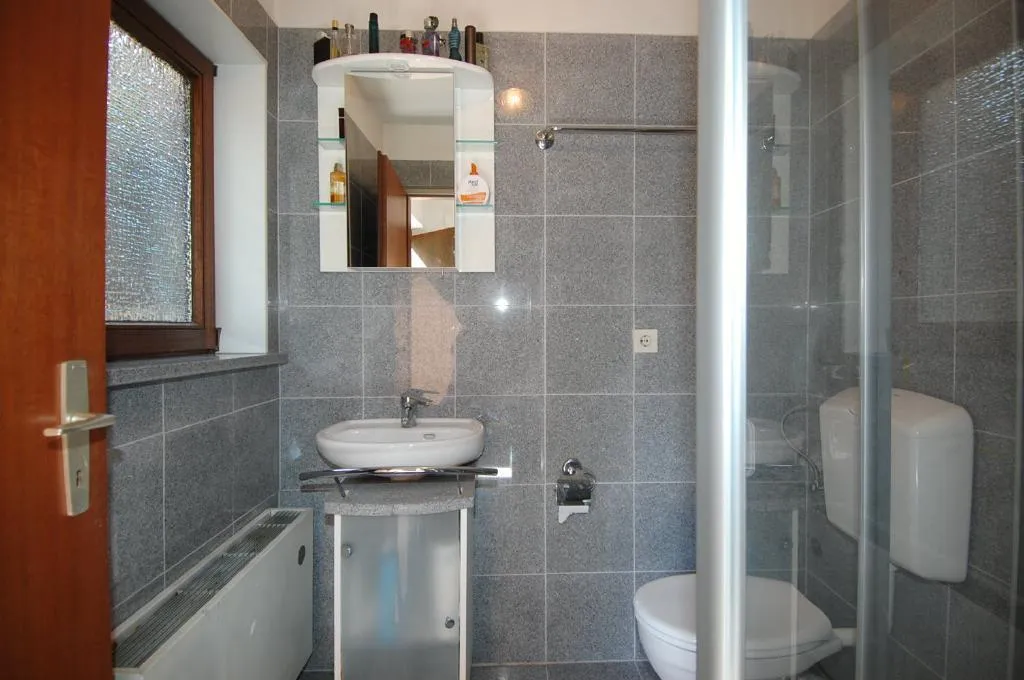 Das Badezimmer ist raumhoch gefliest und mit Dusche, Handwaschbecken, WC und Fenster ausgestattet. Der Boden im Bad und im Flur ist mit Granitplatten gefliest.