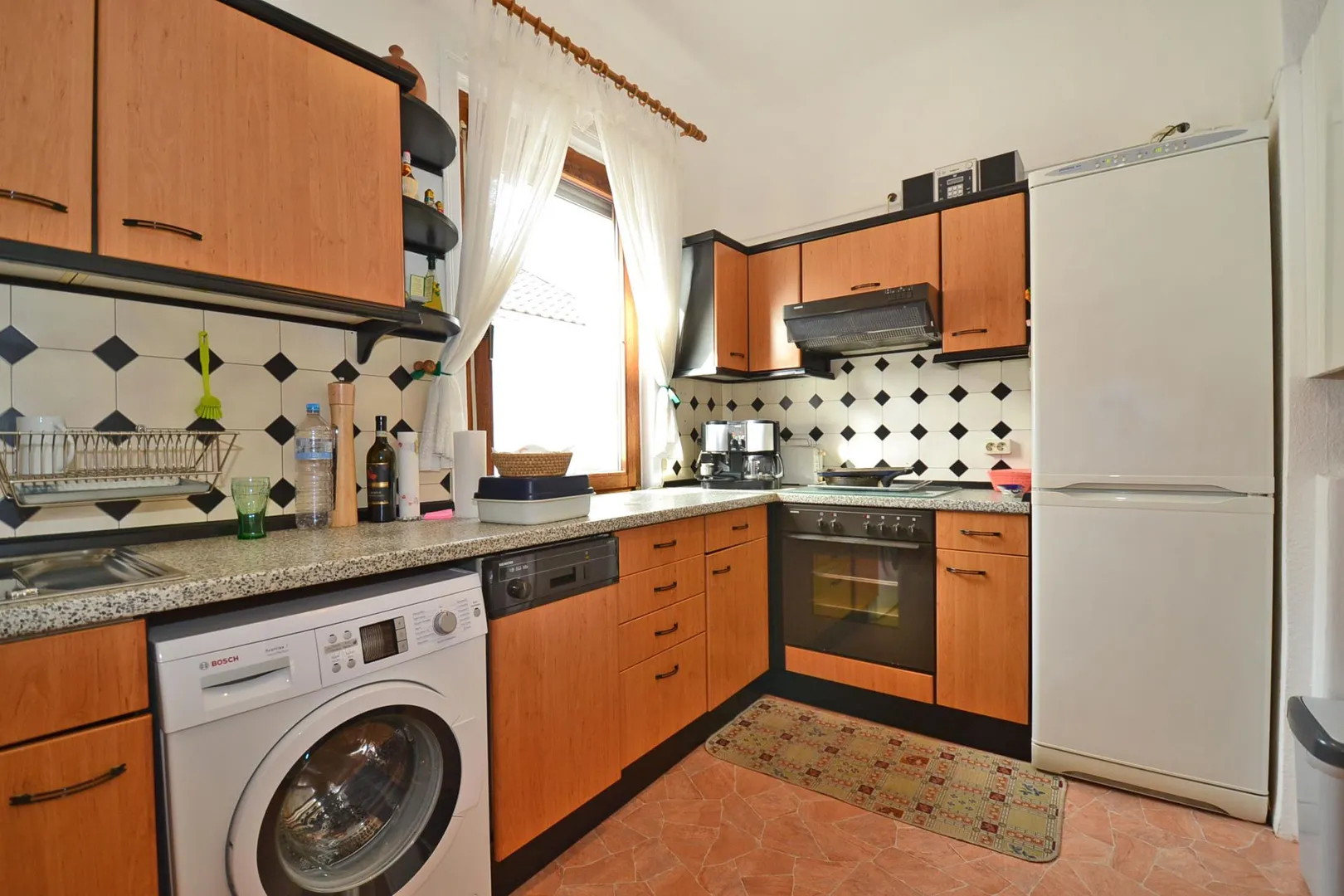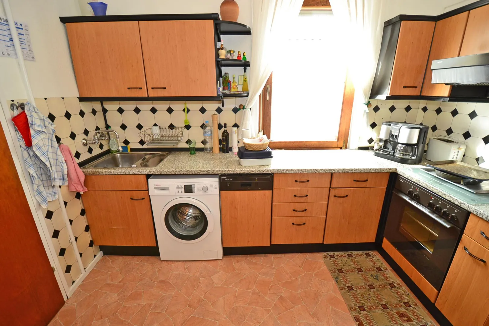 Die Küche verfügt über eine Einbauküche. Die Elektro-Geräte befinden sich im Besitzt des aktuellen Mieters und können auf Wunsch für eine Ablöse von EUR 600,- von ihm erworben werden. Hierzu gehören ein großer Kühl- und Gefrierschrank, Elektro-Kochfeld mit Backofen und eine schmale 45er-Spülmaschine. Der Waschmaschinenanschluss befindet sich in der Küche. Die Waschmaschine wird nicht mitverkauft.