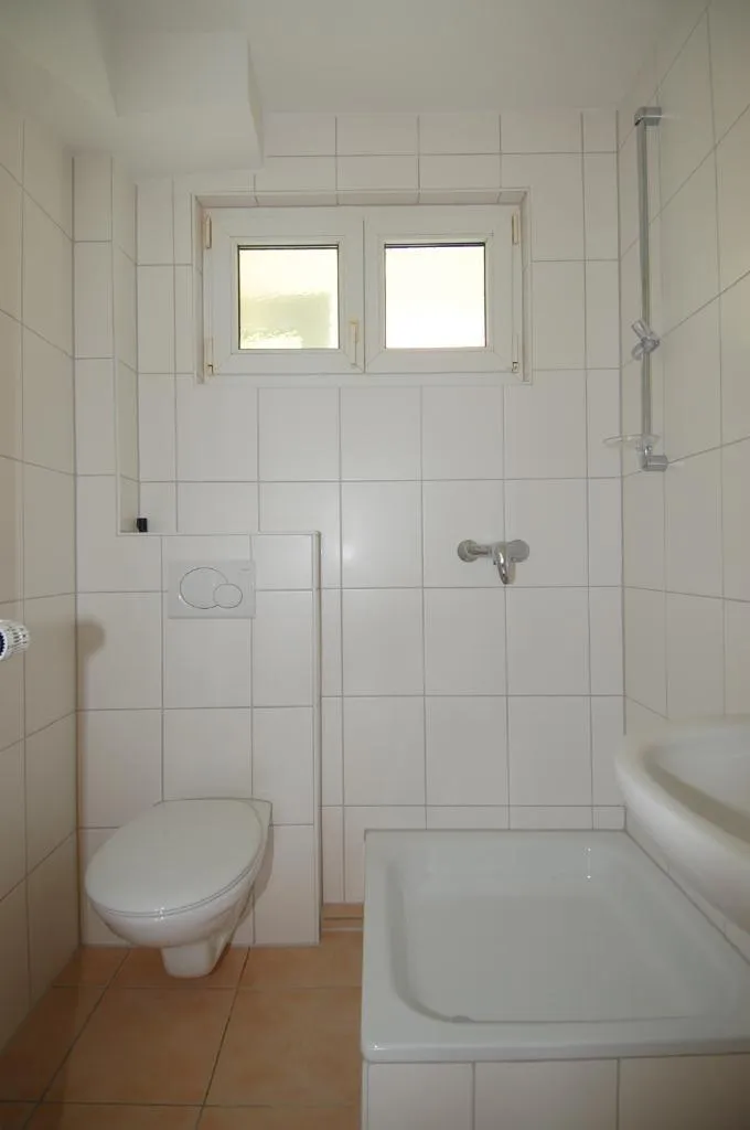 Das Bad ist raumhoch gefliest und mit Fliesenboden, Fenster, Dusche und WC ausgestattet.