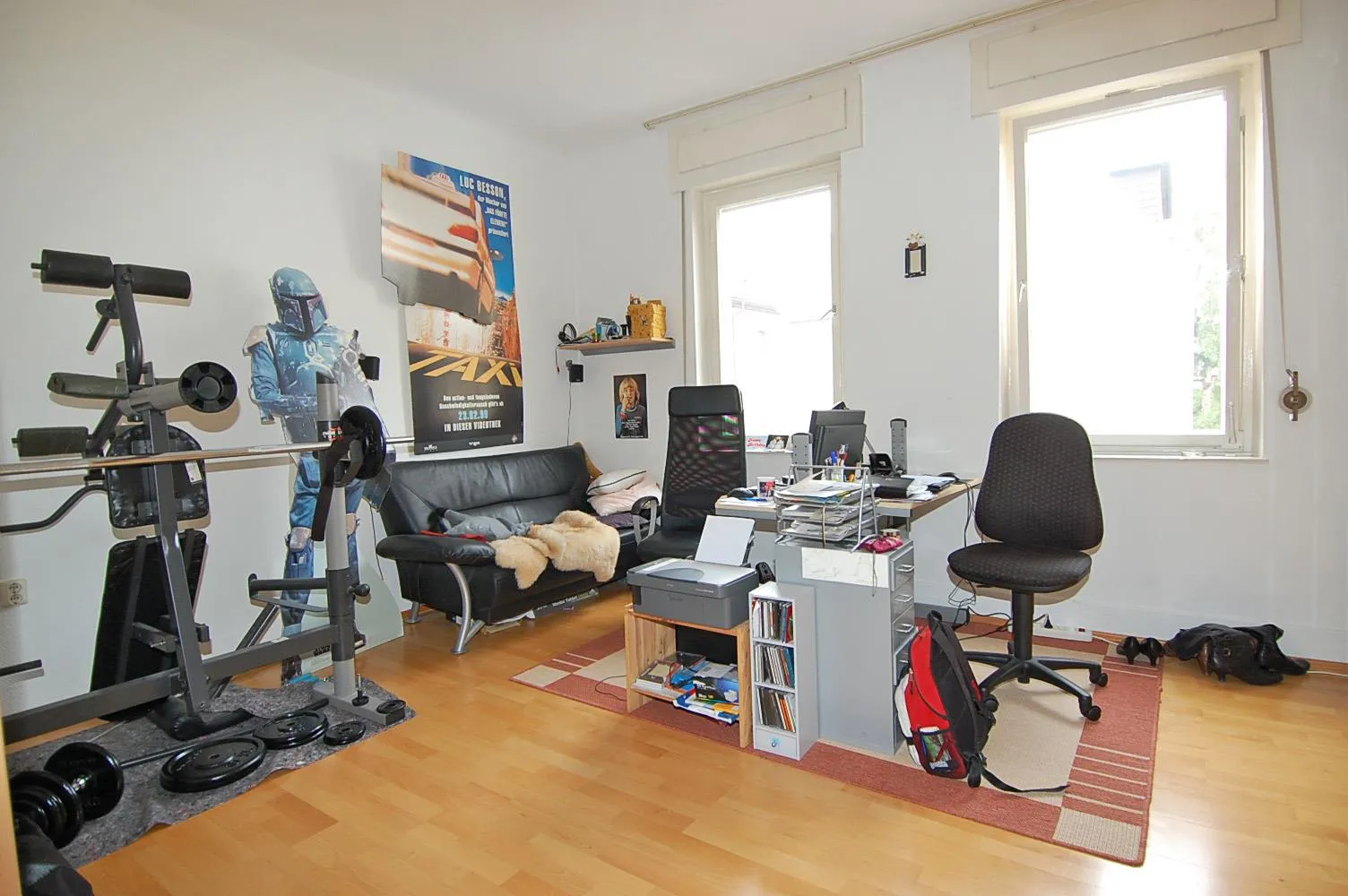 Das Arbeitszimmer verfügt über Glasfasertapete und Parkettboden.