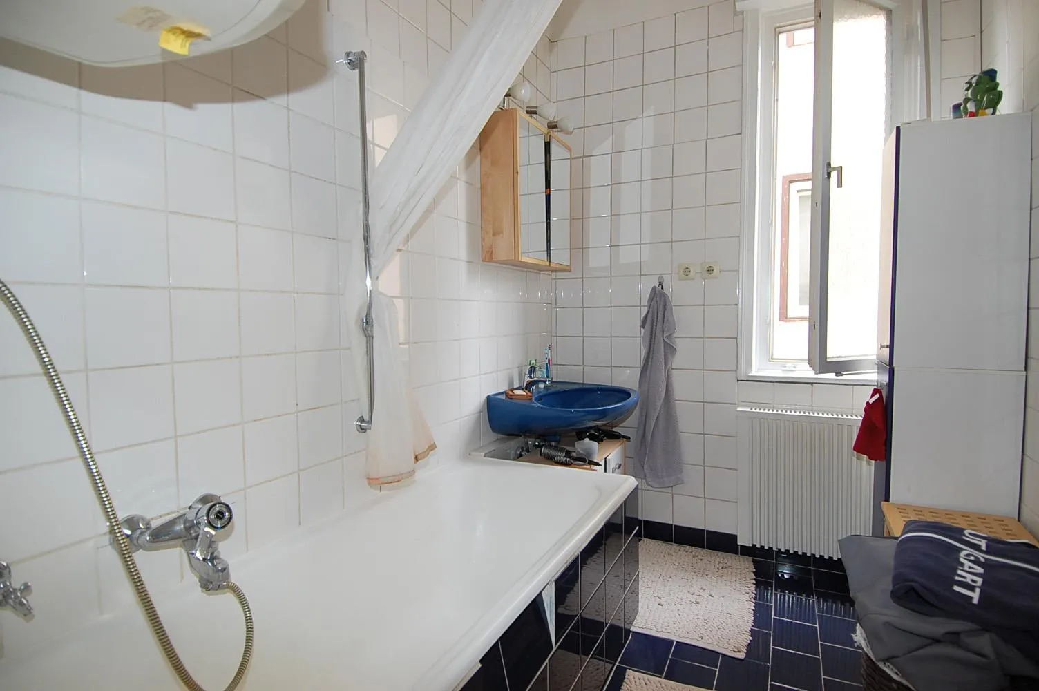 Das Badezimmer ist raumhoch gefliest und verfügt über Fliesenboden, Fenster, Badewanne, Elektroheizung und einen Warmwasser-Boiler.