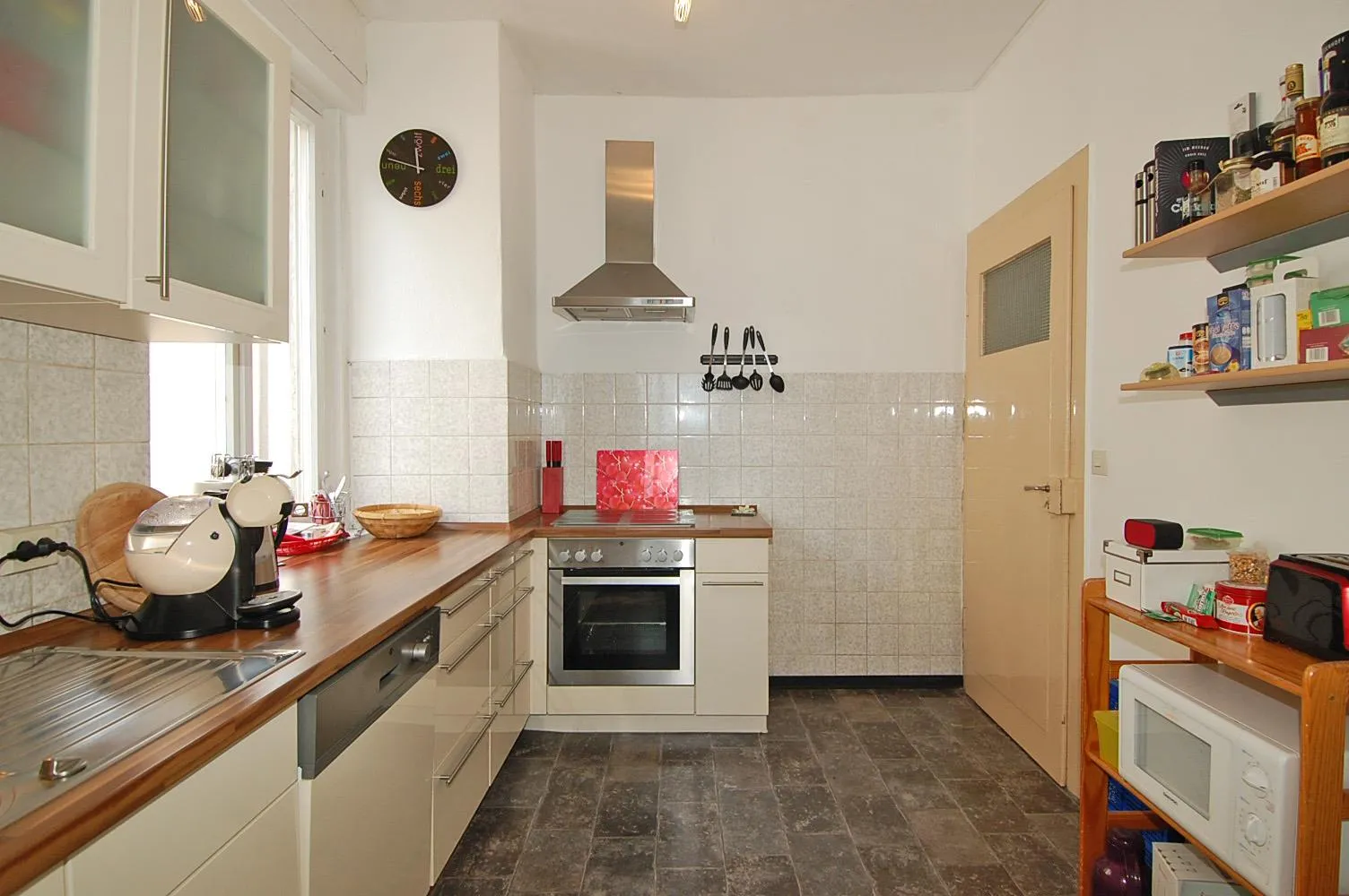 Die Küche ist mit PVC-Boden in Steinboden-Optik ausgestattet und verfügt über eine moderne Einbauküche von 2008 mit Cerankochfeld/Backofen, Dunstabzug, Geschirrspülmaschine, einer Spüle sowie gepflegten Ober- und Unterschränken. Ein Kühlschrank ist nicht vorhanden und sollte vom zukünftigen Mieter mitgebracht werden.
