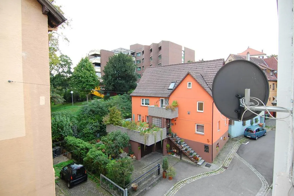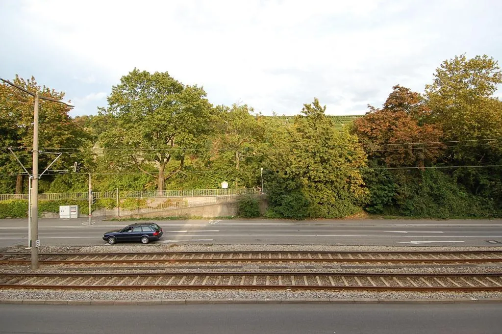Direkt gegenüber befindet sich die Stadtbahn-Haltestelle U14 "Münster Rathaus" und der Neckar.