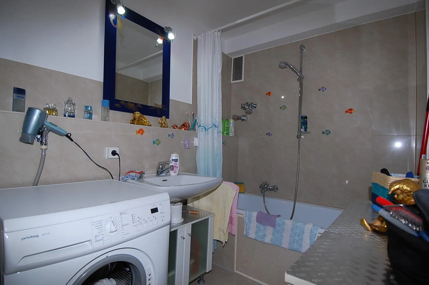 Das Badezimmer ist halbhoch gefliest, mit einer Badewanne und einem Waschmaschinenanschluß ausgestattet. Das WC ist separat.
