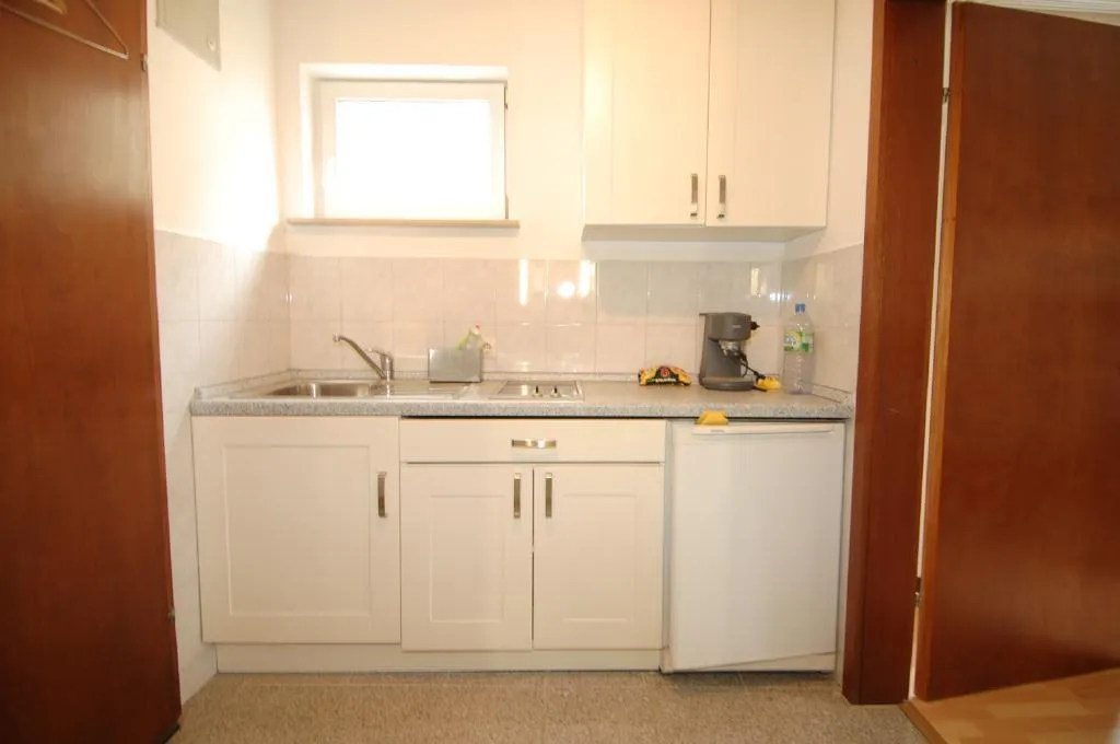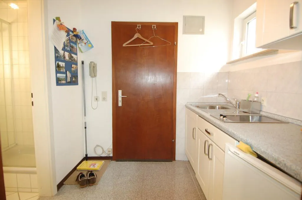 Der Flur- und Küchenbereich ist gefliest. Im Flurbereich befindet sich eine Küchenzeile. Die Küchenzeile ist mit einem Kühlschrank und einem Herd mit Backofen ausgestattet.