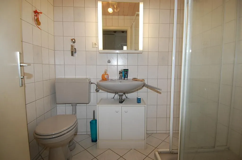 Das Badezimmer ist raumhoch gefliest und ist ausgestattet mit einem Fliesenboden, einer Dusche und einem WC.