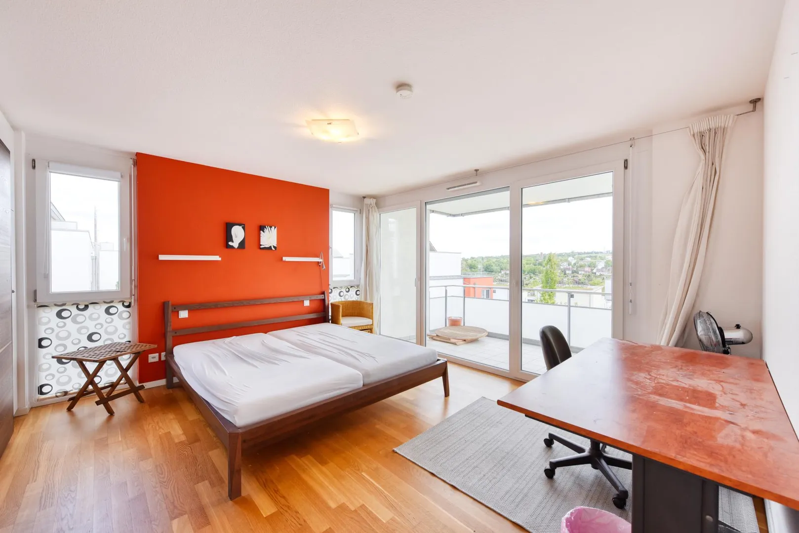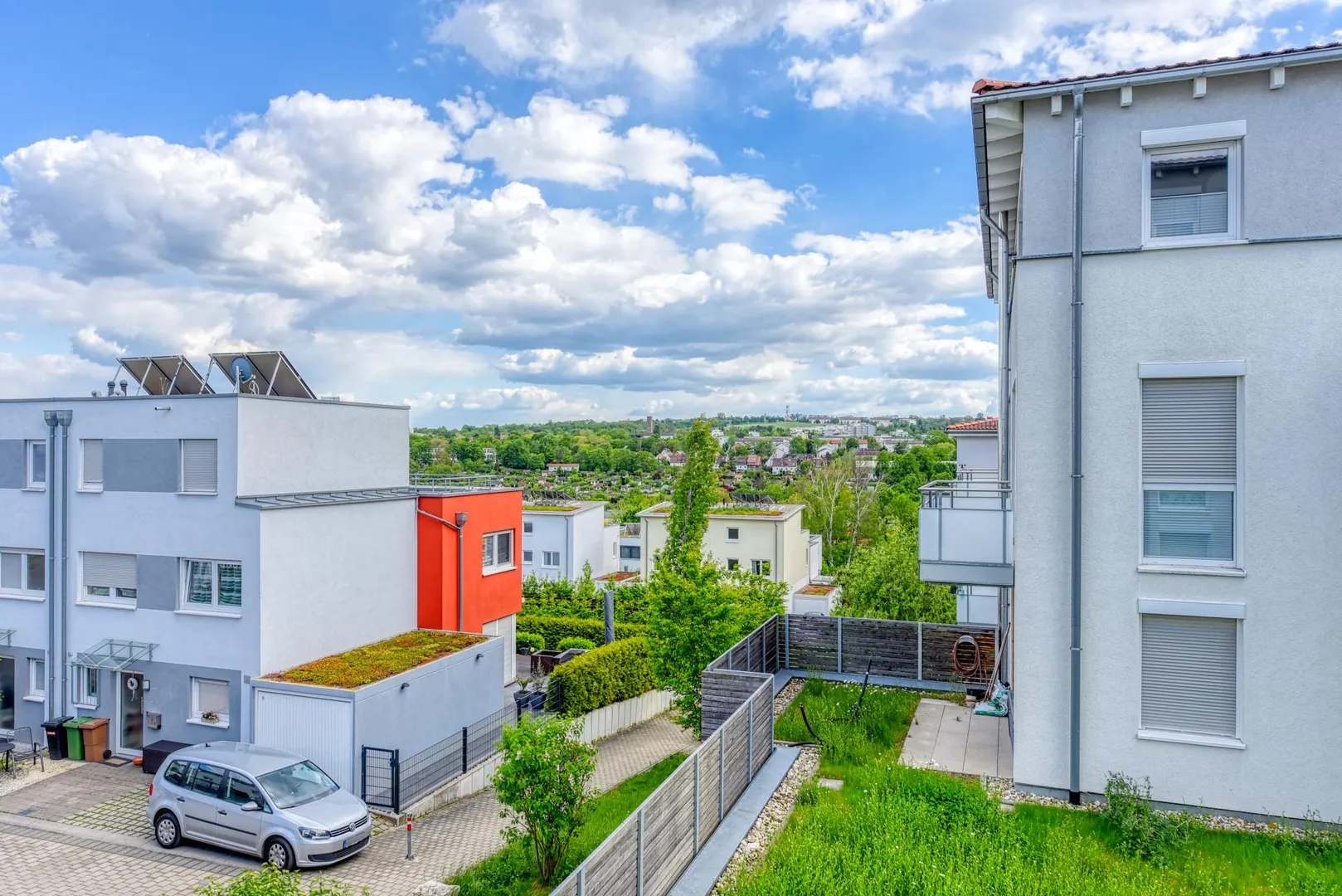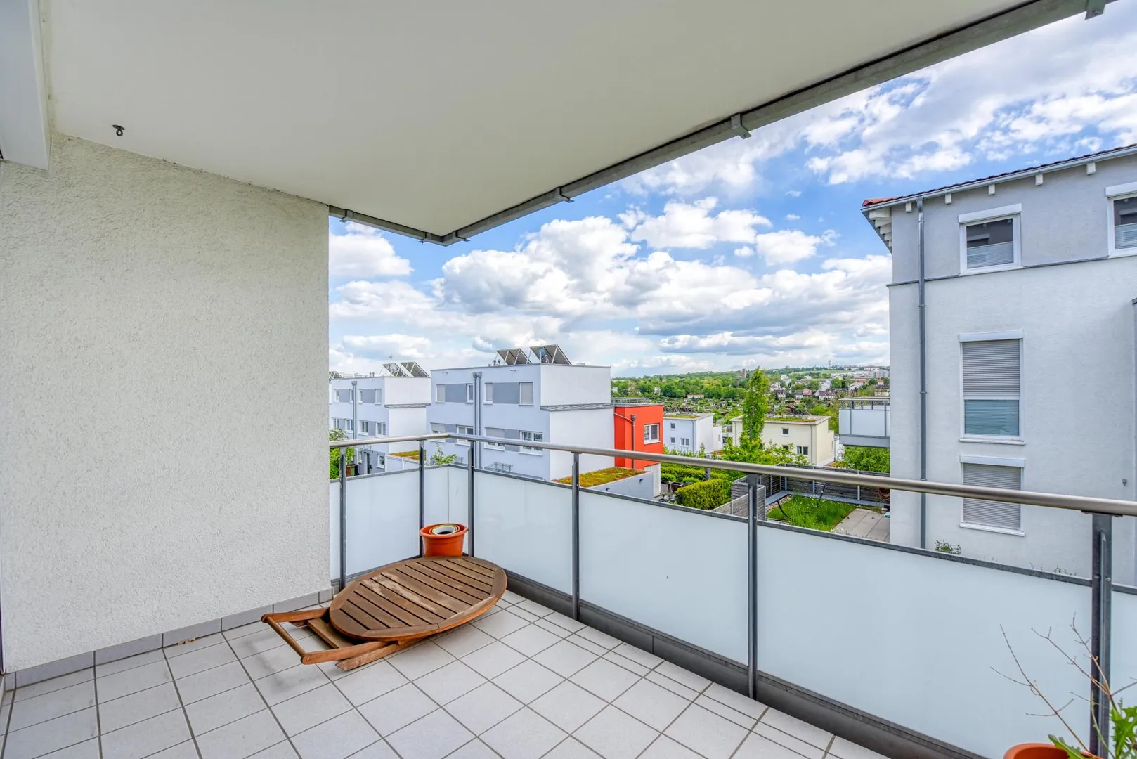 Das Schlafzimmer ist nach Osten und Süden ausgerichtet, das Kinder-/Arbeitszimmer ist nach Süden ausgerichtet, das Wohnzimmer mit Essecke und offener Küche ist nach Süden und Westen ausgerichtet. Vom Schlafzimmer gibt es einen Fernblick nach Zuffenhausen-Rot. Vom Wohnzimmer, Ess- und Küchenbereich gibt es einen Blick ins Grüne.
