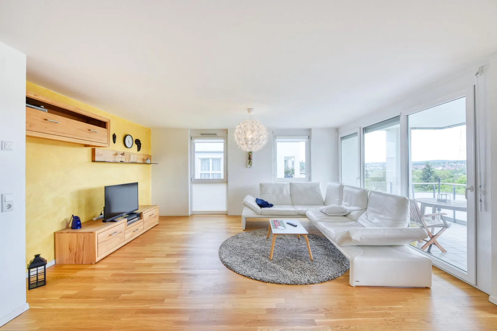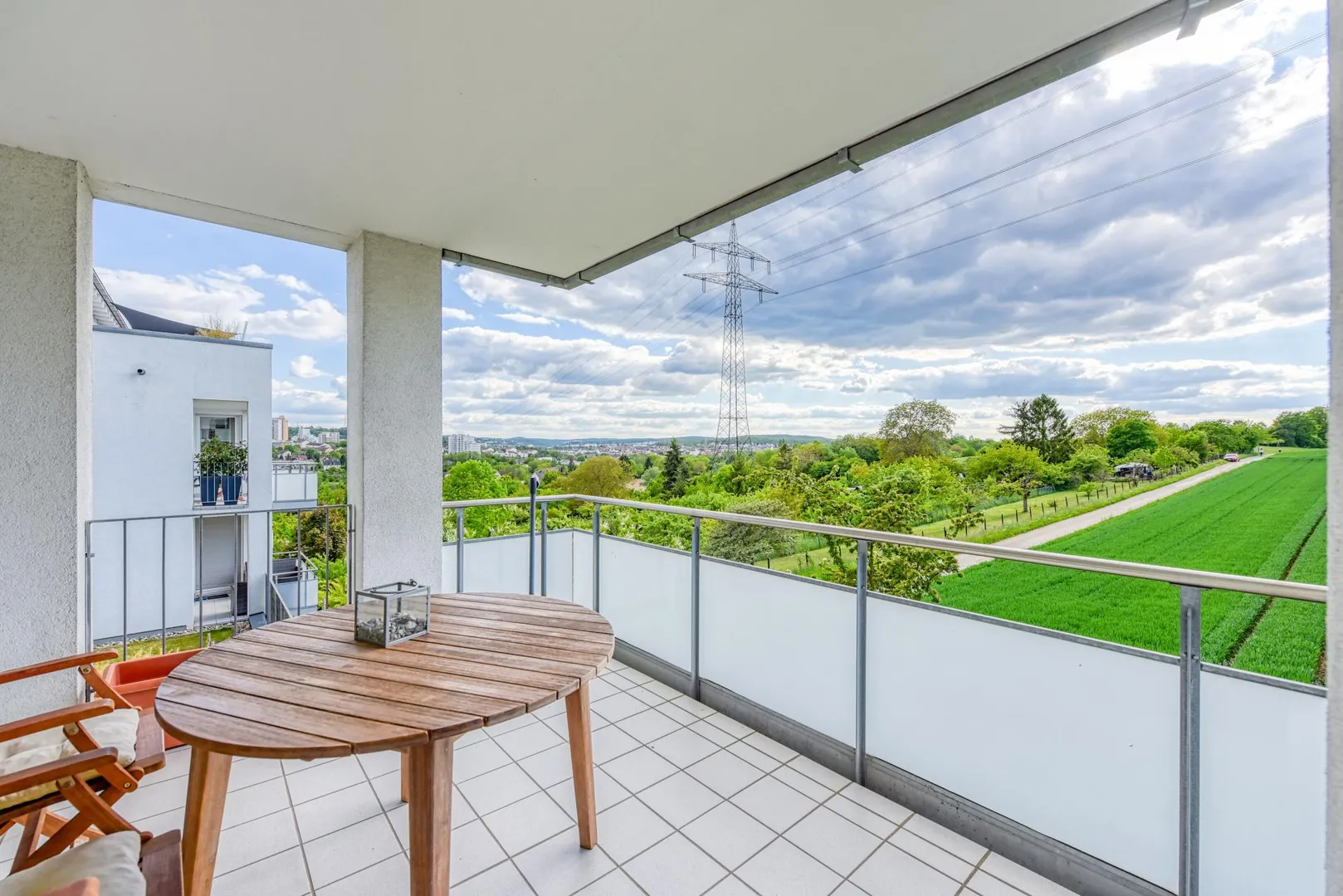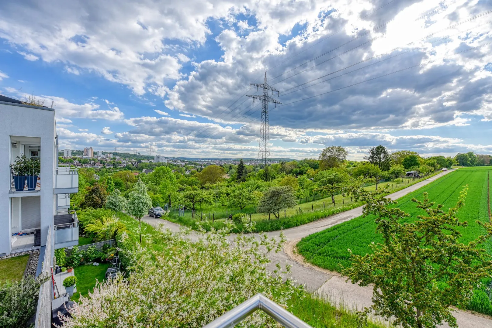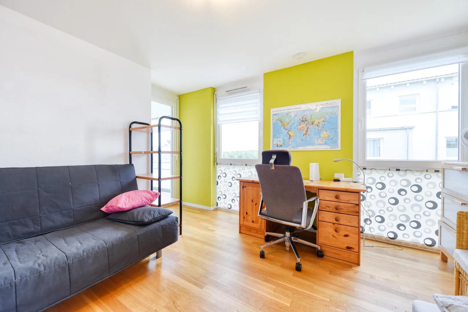 Das Schlafzimmer ist nach Osten und Süden ausgerichtet, das Kinder-/Arbeitszimmer ist nach Süden ausgerichtet, das Wohnzimmer mit Essecke und offener Küche ist nach Süden und Westen ausgerichtet. Vom Schlafzimmer gibt es einen Fernblick nach Zuffenhausen-Rot. Vom Wohnzimmer, Ess- und Küchenbereich gibt es einen Blick ins Grüne.