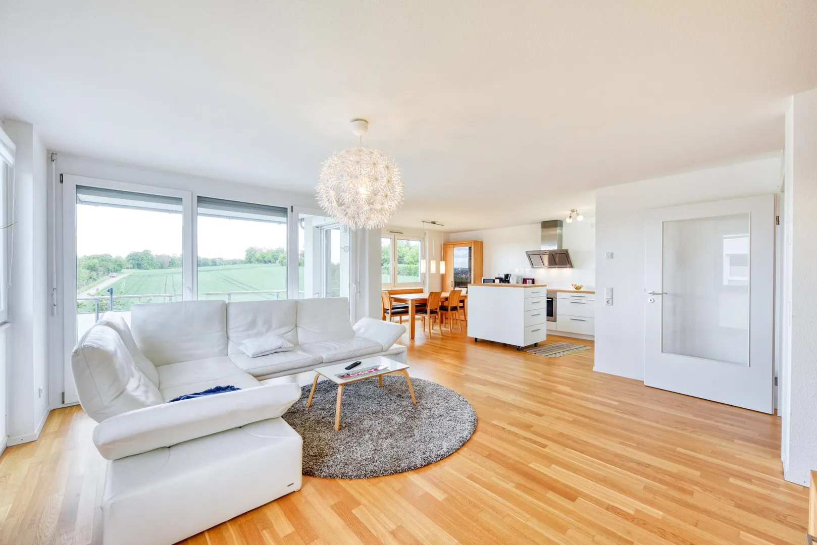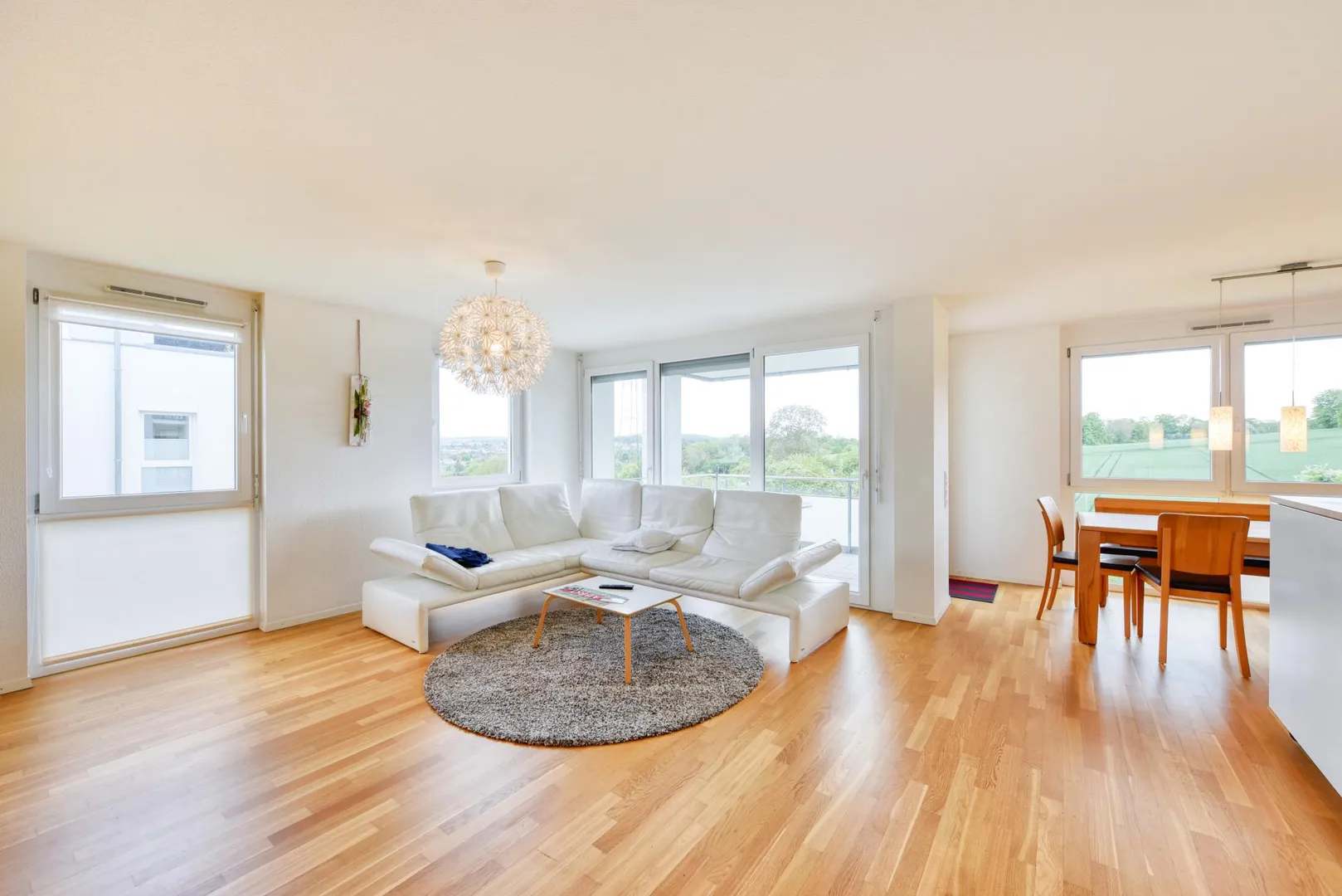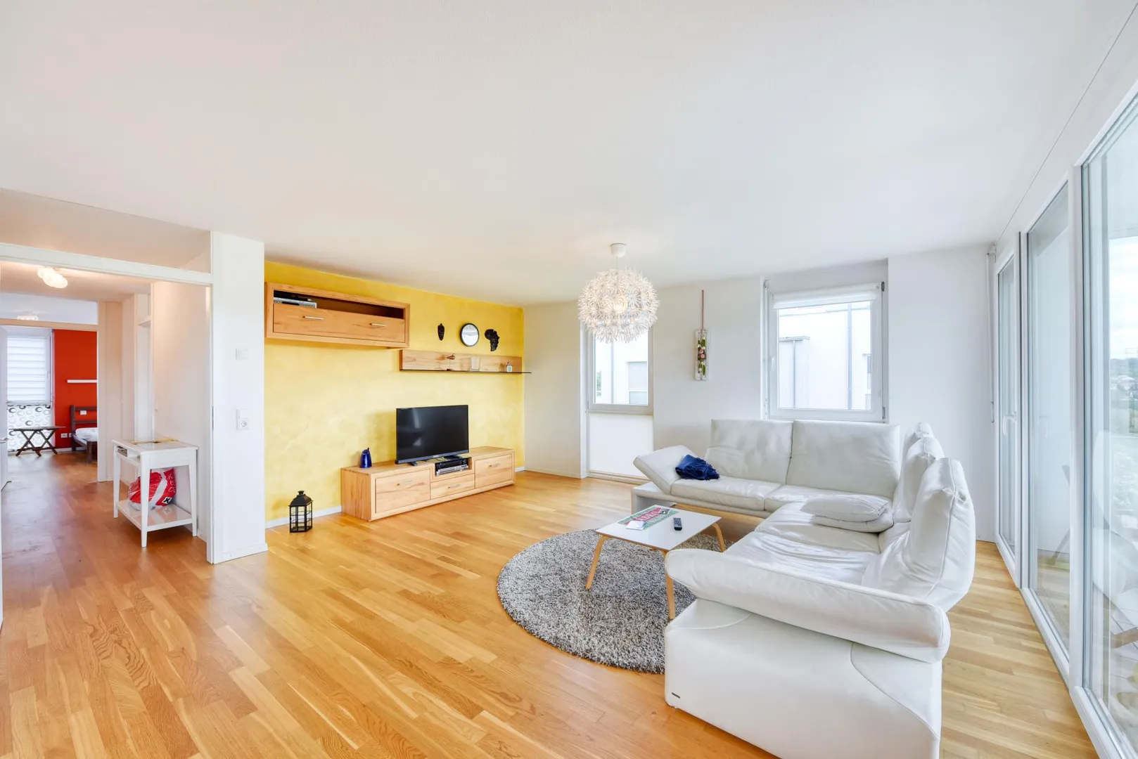 Alle Zimmer, die offene Küche und der Flur sind mit Parkett-Böden ausgestattet. Die Böden im Badezimmer und im WC sind gefliest.