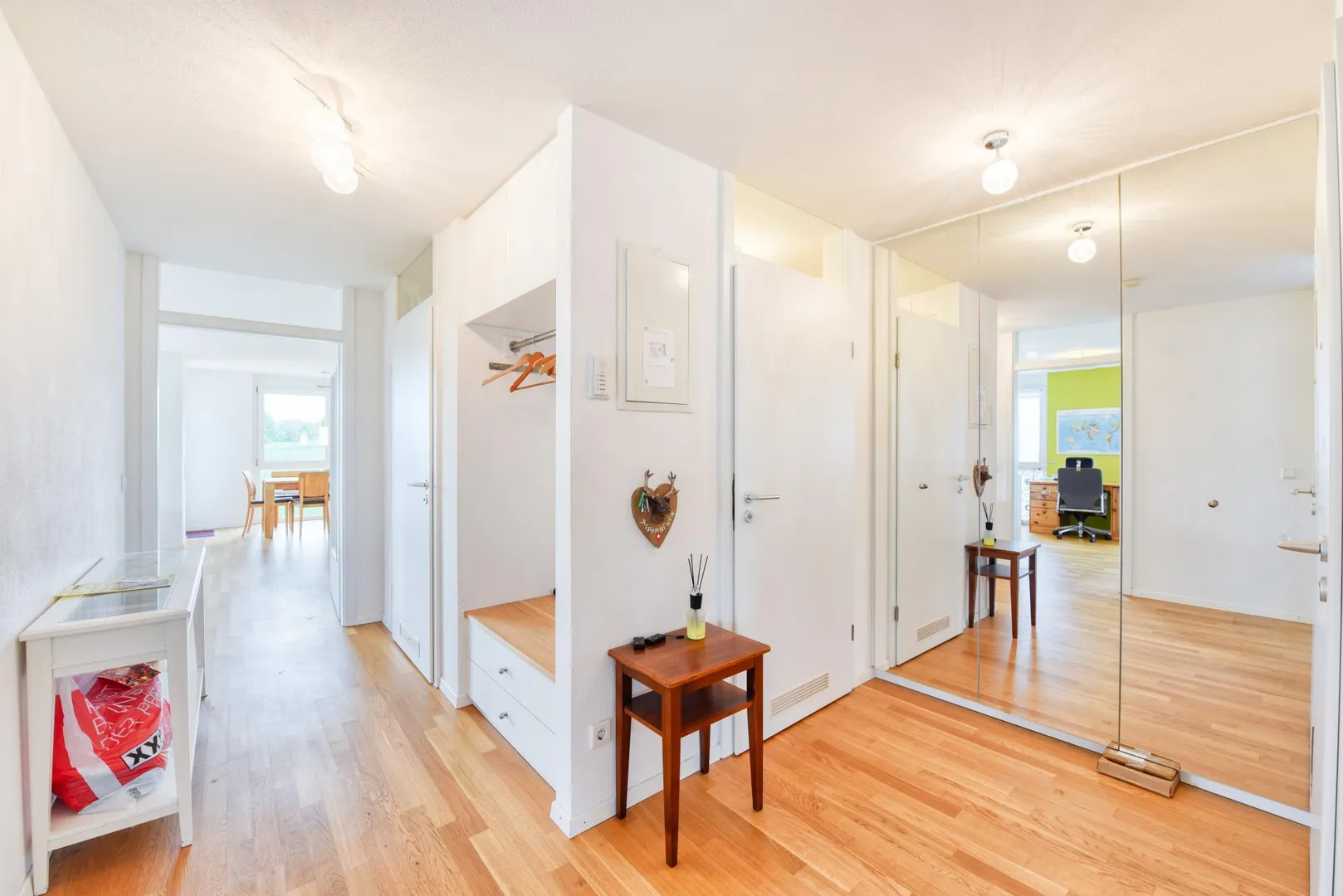 Im Flur gibt es einen eingebauten Garderobenschrank. Im Schlafzimmer gibt es einen eingebauten Kleiderschrank.