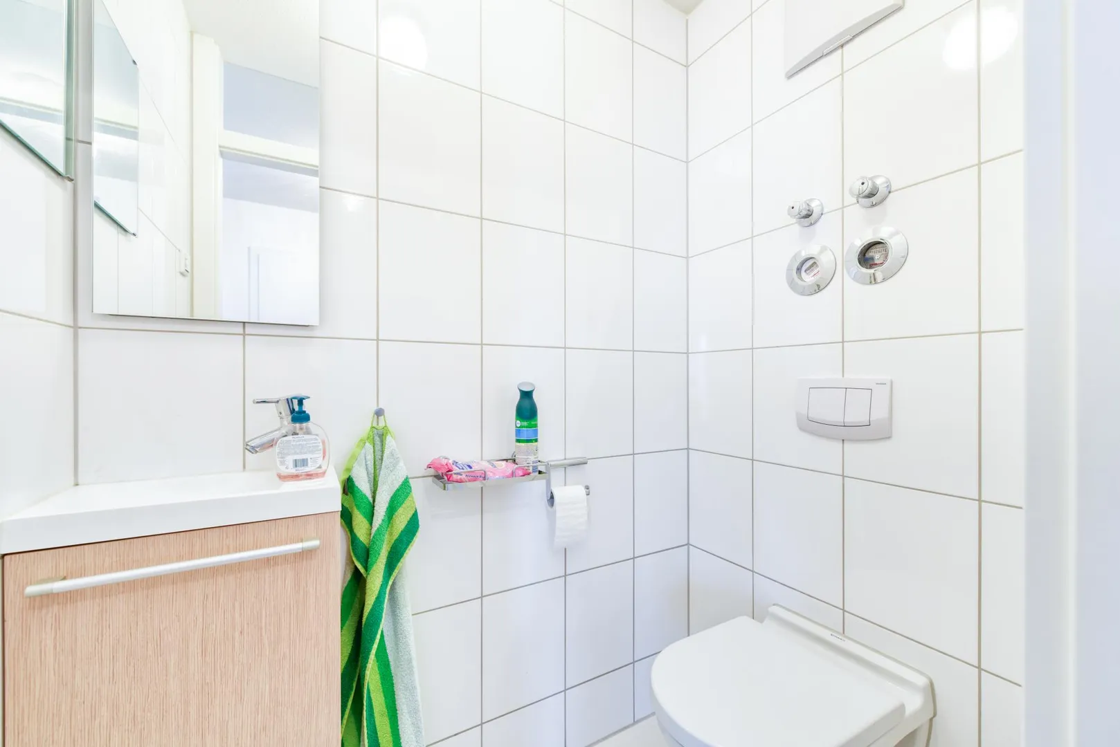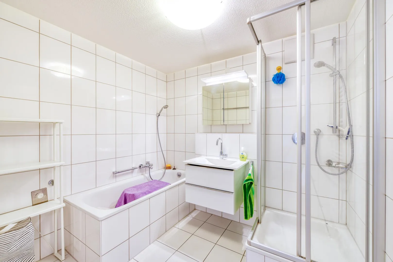Das raumhoch geflieste Badezimmer ist ausgestattet mit einer Wanne, einer Dusche, einem Waschmaschinenanschluss, einem Handtuch-Heizkörper, einem Spiegelschrank sowie einem Waschtisch-Unterschrank.