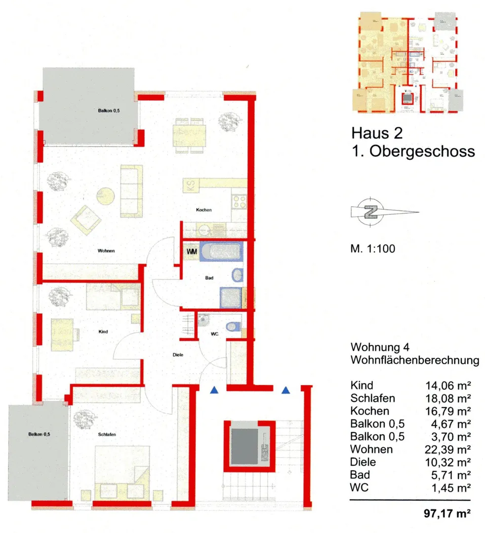 Der Grundriss ist gut. Alle Räume sind direkt vom Flur begehbar. Der ca. 7,4 m² große Süd-Balkon ist vom Schlafzimmer und vom Kinder-/Arbeitszimmer begehbar. Der ca. 9 m² große West-Balkon ist vom Wohnzimmer begehbar. Die Küche ist zum Wohn-/Essbereich hin offen. Das Badezimmer ist innenliegend. Das WC ist separat.