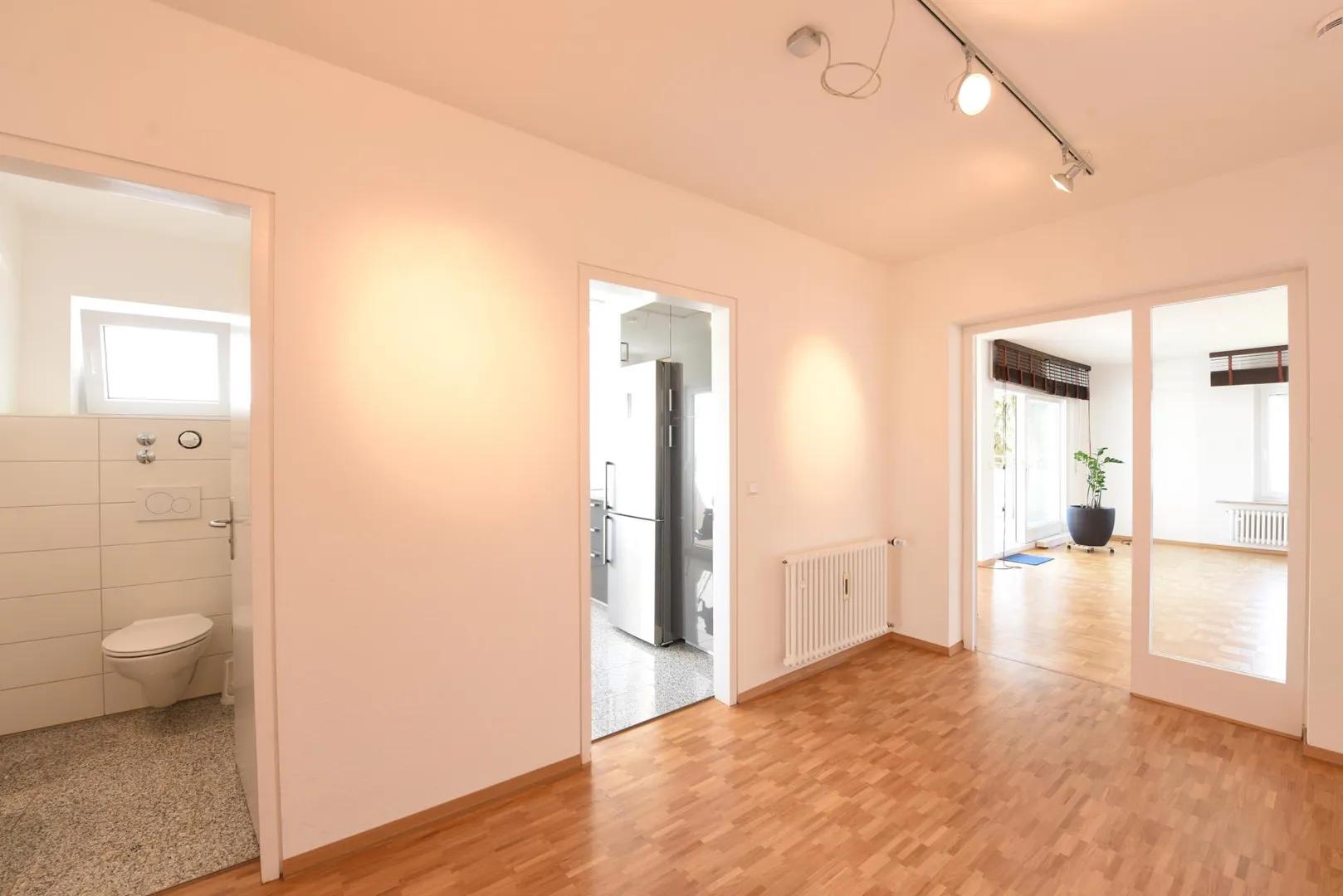 Der Grundriss ist sehr gut. Alle Räume sind direkt von der Diele begehbar. Das Badezimmer sowie das separate WC verfügen über ein Fenster. Der ca. 16,5 m² große und komplett überdachte Süd-Balkon ist über das Wohnzimmer begehbar.